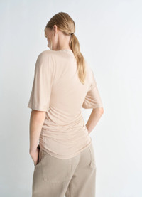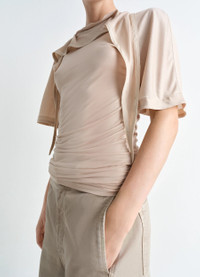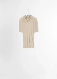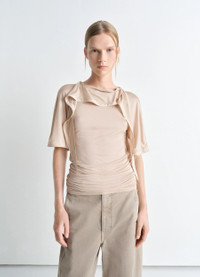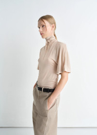 This Short Sleeve Foulard Top is crafted from silk jersey, a fluid and lightweight fabric with an incredibly soft feel. The silhouette is gently fitted, with a relaxed short sleeve and subtle shaping at the waist. A pointed foulard in the same fabric is attached to the V-shape stand collar at the front, allowing you to tie or untie it for versatile styling. Topstitching details accent the sleeves, the shoulders, the neckline and the integrated scarf. DETAILS Straight fit High neck with integrated scarf Topstitching details Made in Portugal Style: TO1337 LJ1011 The Model is 179cm / 5'10½" ft and is wearing a size 36 (S). FABRICS & CARE Main Fabric: 100% Silk Hand wash Do not bleach Do not tumble dry Cool ironing Soft dry clean Dry flat Discover the traceability