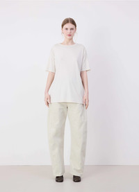 This unisex style is a staple in the LEMAIRE wardrobe. Reimagined this season in a heavy silk jersey with a soft and warm touch, this boxy T-shirt has round armholes for comfort and a single stitch detail along the hem and cuff. The round neck features a twin needle stitching detail. DETAILS - Boxy fit - Round neck - Short sleeves Made in Portugal Style: TO1295 LJ1026 FABRICS & CARE Main Material: 100% Silk Soft wash 30° Do not bleach Do not tumble dry Cool ironing Do not dry clean Dry flat