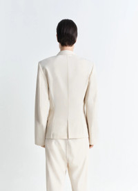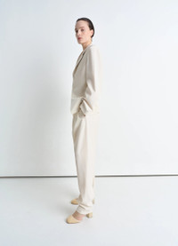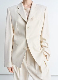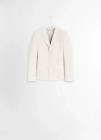This jacket exemplifies the more structured side of LEMAIRE’s tailoring know-how. It is crafted in wool viscose gabardine, a light material with a flat and compact hand. Among classic tailoring details are a structured shoulder, a notched collar, two structuring darts on the front and the back, a lapel buttonhole, and single-breasted corozo buttoning. Two seam pockets sit at the hip, accentuating the feminine hourglass silhouette. An interior pocket adorns the breast to house your small daily essentials. A classic back slit adds extra comfort to this half-lined style. DETAILS - Fitted shape - Padded shoulders - Three corozo buttons - Seam pockets - Inside pocket - Contrast top-stitching details - Half lined Made in Romania Style: JA1071 LF1362 The Model is 177cm / 5'9½'' ft and is wearing a size 36 (S). FABRICS & CARE Main Fabric: 54% Wool, 46% Viscose Main Lining: 51% Cotton, 49% Viscose Second Lining: 100% Cotton Do not wash Do not bleach Do not tumble dry Cool ironing Soft dry clean Discover the traceability