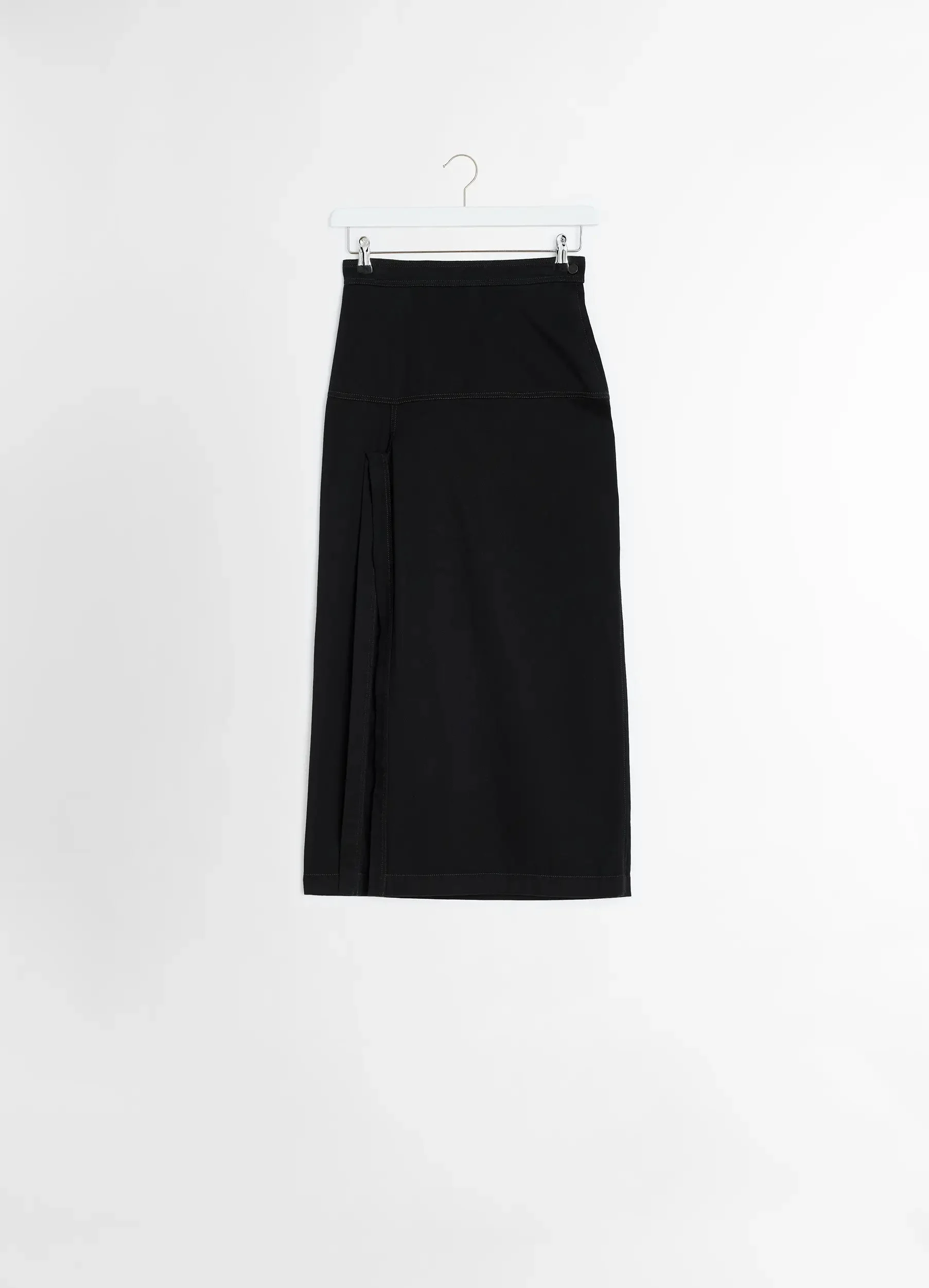 This piece reinterprets a LEMAIRE wardrobe classic. The Asymmetrical Wrap Skirt is crafted from lightweight cotton denim with a washed finish for a soft hand. It features a belted waist secured with a corozo button on the left hip and a metal zip closure. At the back, an adjustable tab with an embroidered eyelet buckle allows for a high-waisted fit, depending on your preference. This midi-length style has a curved slit along the right thigh. Contrast stitching runs throughout the skirt, highlighting its construction. DETAILS - Straight fit - Midi length - Adjustable waist height - Tightening back buckle - Slitted - Zip fly Made in Morocco Style: SK1046 LD1028 The Model is 180cm / 5'11" ft and is wearing a size 36 (S). CARE Main Fabric: 100% Cotton Soft wash 30° Do not bleach Do not tumble dry Cool ironing Soft dry clean Wash upside down