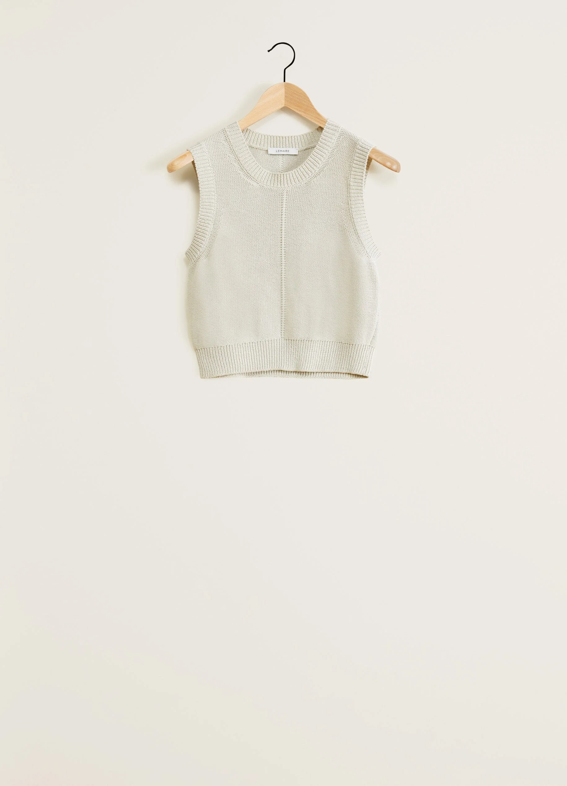 This sweater is a new addition to LEMAIRE’s wardrobe. It is made in silky Pima cotton, a textured summery fabric which allows the garment to be comfortable and slightly raised. Sleeveless, this cropped sweater features a crew neck as well as rib finishings at the waist, collar and armholes. On the chest and in the back, a raised line divides the sweater in two, accentuating the fitted silhouette. DETAILS Straight fit Crew neck Sleeveless Made in Italy Style: TO1208 LK1022 FABRICS & CARE Main Material: 100% Cotton Hand wash Do not bleach Do not tumble dry Cool ironing Soft dry clean Dry flat