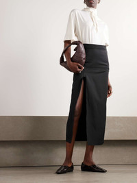 EDITORS'NOTES The timelessness of Parisian style inspires LEMAIRE's designs. Tailored from panels of lightweight wool-blend, this midi skirt sits high on the waist and has a slim shape with a leg-baring split. Use the buckled tab at the back to adjust the fit. SIZE & FIT Model measurements: - Fits true to size, however those who are between sizes should take the smaller size - Midi-length, designed to be worn at the waist - Lightweight, non-stretchy fabric - Model is 177cm/ 5'10" and is wearing a FR 34 - Bust: 80cm/ 31.5" - Waist: 60cm/ 23.5" - Hip: 89cm/ 35" DETAILS & CARE - Black wool-blend - Concealed button, hook and zip fastening at side - 54% wool, 46% viscose - Dry clean