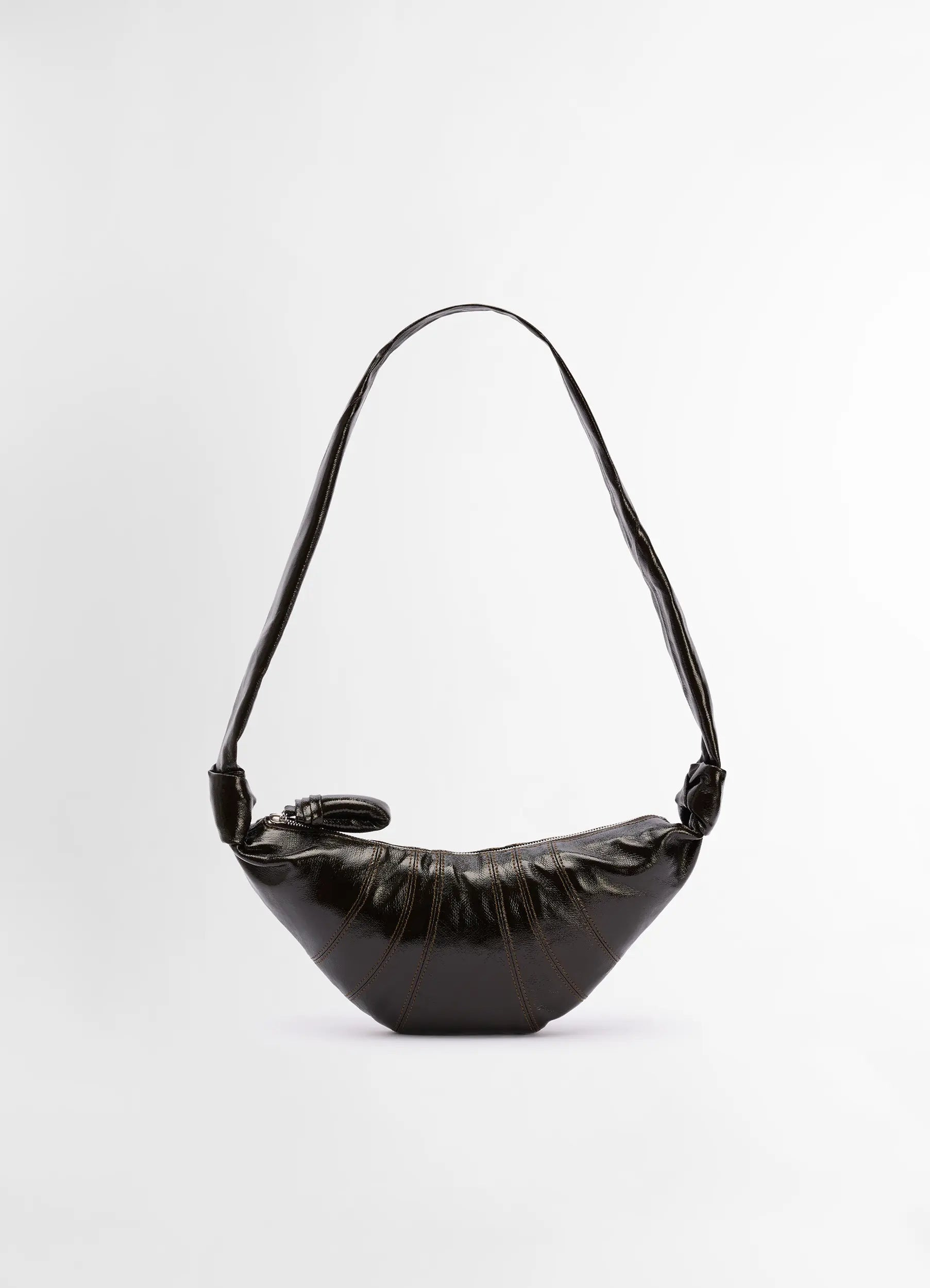 This classic LEMAIRE bag is part of the iconic Croissant family. The Small Croissant is made from coated cotton with a crisp texture and a shiny finish, which was granted a GOT Certification. Its distinctive surface adds a tactile element and contributes to its durability. Inspired by the shape of the eponymous pastry, this vegan bag is achieved through an assembly of top-stitched cutouts, blending style and functionality. It features a matching looped zip puller and side knot finishings. It will host small accessories such as a smartphone, a card holder and a wallet, and can be worn over the shoulder or cross-body. This classic LEMAIRE bag is part of the iconic Croissant family. The Small Croissant is made from coated cotton with a crisp texture and a shiny finish, which was granted a GOT Certification. Its distinctive surface adds a tactile element and contributes to its durability. Inspired by the shape of the eponymous pastry, this vegan bag is achieved through an assembly of top-stitched cutouts, blending style and functionality. It features a matching looped zip puller and side knot finishings. It will host small accessories such as a smartphone, a card holder and a wallet, and can be worn over the shoulder or cross-body. DETAILS - This bag can be worn on the shoulder or cross-body - Height of the shoulder strap: 43cm / 17in - Length: 35cm / 14in - Width: 16cm / 6in - Depth: 5cm / 2in - Lining in cotton canvas - Metal Looped zip puller - Small interior patch pocket (can contain cards, small keys or a public transportation pass) - Main compartment (can contain smartphone, card holder, Airpods Pro 2 case and wallet) - Side knot finishings - Embossed logo inside Made in Tunisia Style: BG0003 LF1329 - This bag can be worn on the shoulder or cross-body - Height of the shoulder strap: 43cm / 17in - Length: 35cm / 14in - Width: 16cm / 6in - Depth: 5cm / 2in - Lining in cotton canvas - Metal Looped zip puller - Small interior patch pocket (can contain cards, small keys or a public transportation pass) - Main compartment (can contain smartphone, card holder, Airpods Pro 2 case and wallet) - Side knot finishings - Embossed logo inside Made in Tunisia Style: BG0003 LF1329 CARE Main Fabric: 100% Cotton Main Lining: 100% Cotton Do not wash Do not bleach Do not tumble dry Do not iron Professional cleaner only Main Fabric: 100% Cotton Main Lining: 100% Cotton Do not wash Do not bleach Do not tumble dry Do not iron Professional cleaner only