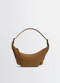 Inspired by the iconic Croissant line, the Soft Game bag is an emblematic model for versatile wear. Ideal for everyday use, it features embroidered eyelets and matching laces to tighten and adjust its volume. This small, supple bag is made from quilted, water-repellent nylon canvas with a resistant, matte finish. DETAILS Small Soft Game bag in water-repellant nylon canvas Soft quilted, and topstitched model Hand, shoulder, and crossbody carry Adjustable strap with metal buckles and loops Side lacings with matching cords and embroidered eyelets Zipper closure with long, knotted pull tab Nylon lining Zipped inside pocket Lemaire embossed interior label Silver-plated metalwork Dimensions: Length: 47 cm Height: 17.5 cm Depth: 11 cm Arrow height: 38 cm Strap length: 48.5cm Made in Italy Style : BG293 LF1330 CARE Main material: 100% polyamide Main lining: 100% polyamide Do not wash Do not bleach Do not tumble dry Do not iron Professional cleaner only