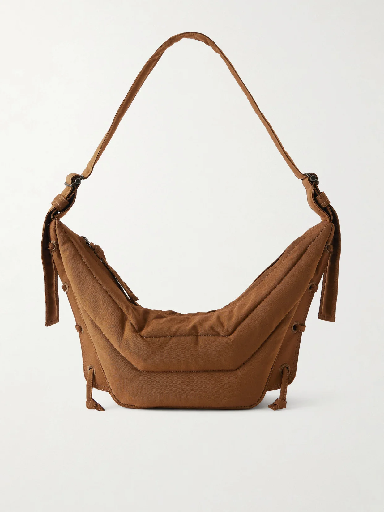 LEMAIRE's shoulder bag draws from its signature ‘Croissant' style, only this version is slouchier, padded for structure and given a practical water-repellent finish. It's made from lightweight garment-dyed canvas and has lace-up sides and an adjustable shoulder strap. It's sized to fit your phone, paperback and wallet. Lower-Impact Materials. This product is made using at least 50% lower-impact materials or ingredients. Find out more about our NET SUSTAIN criteria here.