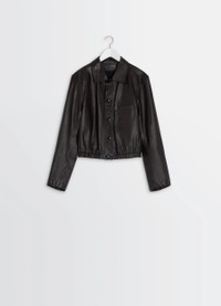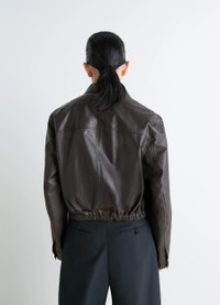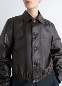 This cropped leather jacket completes Lemaire's feminine wardrobe. It is made from soft cow leather, a lightweight material with a paper-like appearance and natural shine. The model is 177 cm tall and is wearing a size 36 (S). This cropped leather jacket completes Lemaire's feminine wardrobe. It is made from soft cow leather, a lightweight material with a paper-like appearance and natural shine. The model is 177 cm tall and is wearing a size 36 (S). DETAILS Soft leather blouson Straight cut, cinched at the waist .Fully lined model Shirt collar Button closure Long sleeves Straight buttoned cuffs Welted chest pocket Elasticated waistband Inside patch pocket Made in Turkey Style : OW1158 LL0146 Soft leather blouson Straight cut, cinched at the waist .Fully lined model Shirt collar Button closure Long sleeves Straight buttoned cuffs Welted chest pocket Elasticated waistband Inside patch pocket Made in Turkey Style : OW1158 LL0146 CARE Main Material: 100% Cow Leather Main Lining: 51% Cotton 49% Viscose Second Lining: 100% Cotton Do not wash Do not bleach Do not tumble dry Do not iron Professional leather clean only Main Material: 100% Cow Leather Main Lining: 51% Cotton 49% Viscose Second Lining: 100% Cotton Do not wash Do not bleach Do not tumble dry Do not iron Professional leather clean only