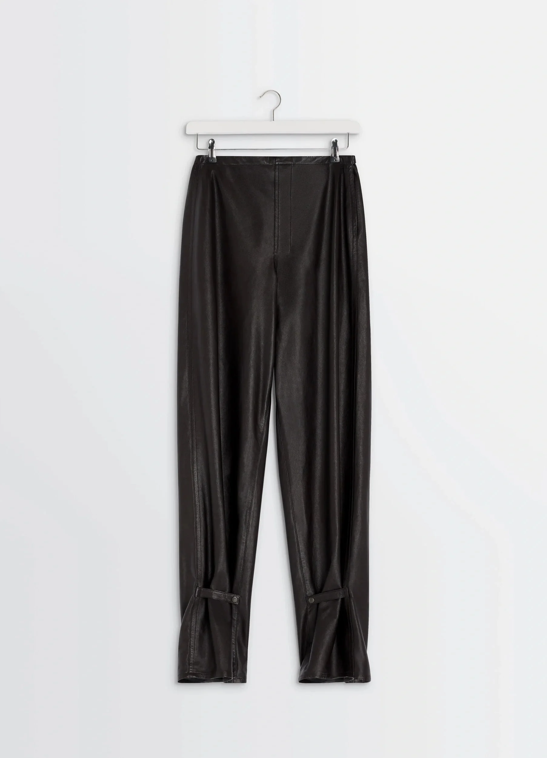 These leather pants, adjustable at the bottom of the leg, complete Lemaire's feminine wardrobe. They are made from soft cow leather, a lightweight material with a paper-like appearance and natural shine. The model is 177 cm and is wearing a size 36 (S). These leather pants, adjustable at the bottom of the leg, complete Lemaire's feminine wardrobe. They are made from soft cow leather, a lightweight material with a paper-like appearance and natural shine. The model is 177 cm and is wearing a size 36 (S). DETAILS Soft leather pants Oversized cut Fully lined model Elasticated waistband at the back Side closure with zipper and snap tab Adjustable model with snap tabs at the ankles Back patch pocket with metal rivets Made in Turkey Style : PA1228 LL0146 Soft leather pants Oversized cut Fully lined model Elasticated waistband at the back Side closure with zipper and snap tab Adjustable model with snap tabs at the ankles Back patch pocket with metal rivets Made in Turkey Style : PA1228 LL0146 CARE Main Material: 100% Cow Leather Main Lining: 63% Viscose 37% Cotton Second Lining: 100% Cotton Do not wash Do not bleach Do not tumble dry Do not iron Professional leather clean only Main Material: 100% Cow Leather Main Lining: 63% Viscose 37% Cotton Second Lining: 100% Cotton Do not wash Do not bleach Do not tumble dry Do not iron Professional leather clean only