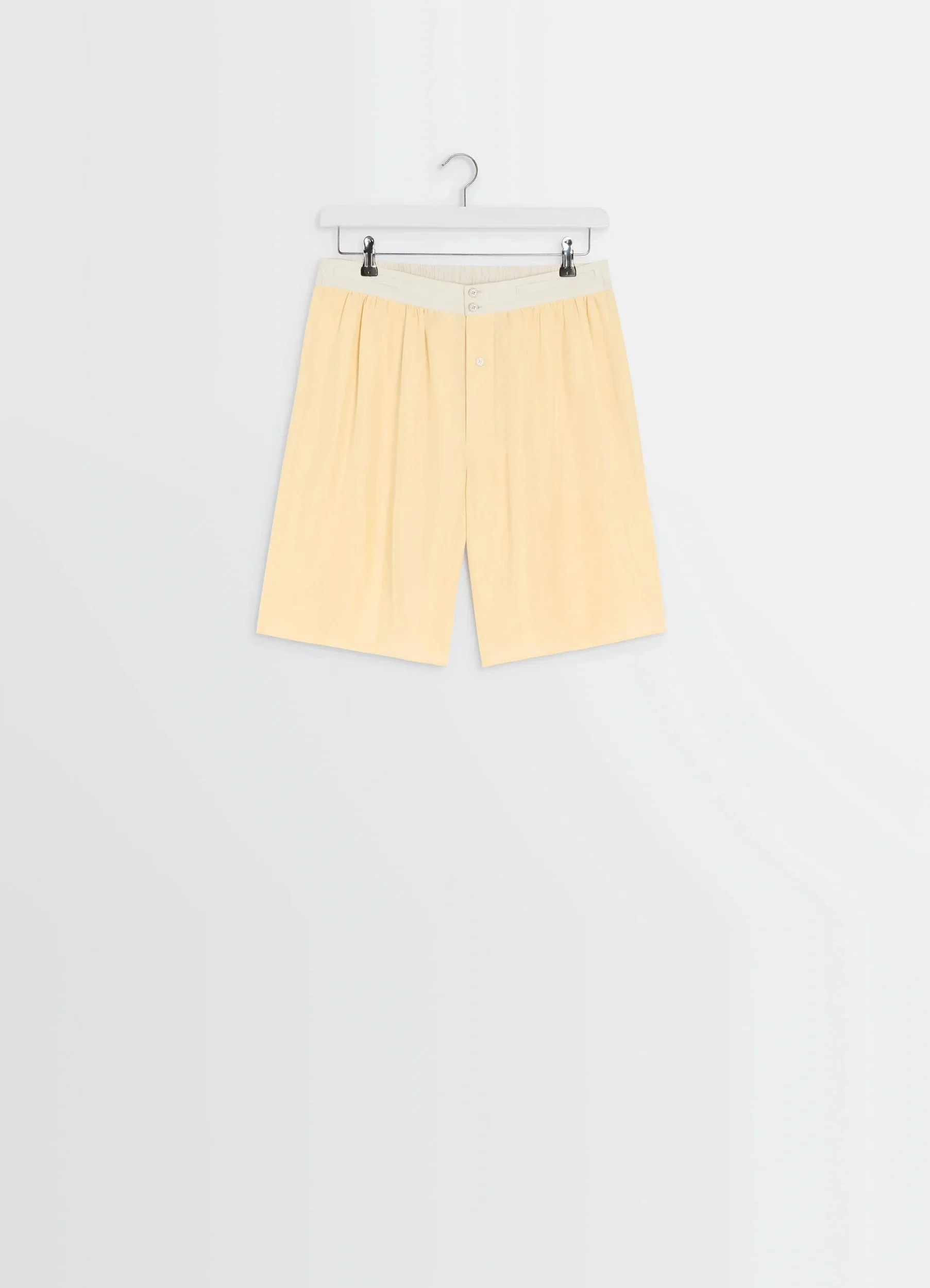 These light shorts reflect the in-and-out spirit dear to Lemaire. Designed to be worn at home or out and about, they are made of silk pongee.The model is 177 cm and is wearing a size 36 (S). DETAILS Light silk pongee shorts Relaxed short cut Contrast elasticated waistband Front closure with mother-of-pearl buttons Gathers at the waist Side pockets Made in Portugal Style : PA1220 LF1459 FABRICS & CARE Main Material: 100% Silk Second Material: 100% Cotton Do not wash Do not bleach Do not tumble dry Cool ironing Soft dry clean