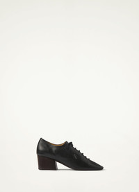 These heeled derbies are made of lamb nappa leather with a shiny finish Inspired by dance shoes, their details include waxed cotton laces, a slightly rounded square toe and Cuban heels. The upper and tongue of the shoes emerge from a single piece of leather folded over itself. They are fully lined in smooth leather. DETAILS Leather lining Waxed cotton laces Stacked leather heel Made in Portugal Style : FO0057 LL0023 This model is wearing a size 39 FABRICS & CARE Main Fabric : 100% Lamb Main Lining : 100% Veal - Calf If exposed to water or high humidity, dry your shoes well with an absorbent cloth and let them air dry before storing them. Smooth leather: Use a soft cloth and apply a measured amount of uncolour milk or cream. Suede leather: Brush lightly with a sponge or special suede cloth.