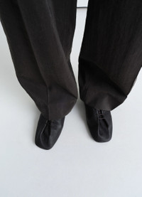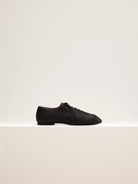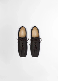 These derbies return this season in LEMAIRE’s iconic Souris line. They are crafted in washed nappa lamb leather with a subtly fading color. Inspired by flamenco dancing slippers, their details include waxed cotton laces, slightly rounded square toes and a flat heel. The upper and tongue of the shoes emerge from a single piece of leather folded over itself. They are fully lined in smooth leather. DETAILS - Leather lining - Waxed cotton laces - Leather sole - Square toe Made in Portugal Style: FO0058 LL0070 FABRICS & CARE Main Material: 100% Lamb Main Lining: 100% Cow Do not wash Do not bleach Do not tumble dry Do not iron Professional leather clean only If exposed to water or high humidity, dry your shoes well with an absorbent cloth and let them air dry before storing them. Smooth leather: Use a soft cloth and apply a measured amount of uncolour milk or cream. Suede leather: Brush lightly with a sponge or special suede cloth.