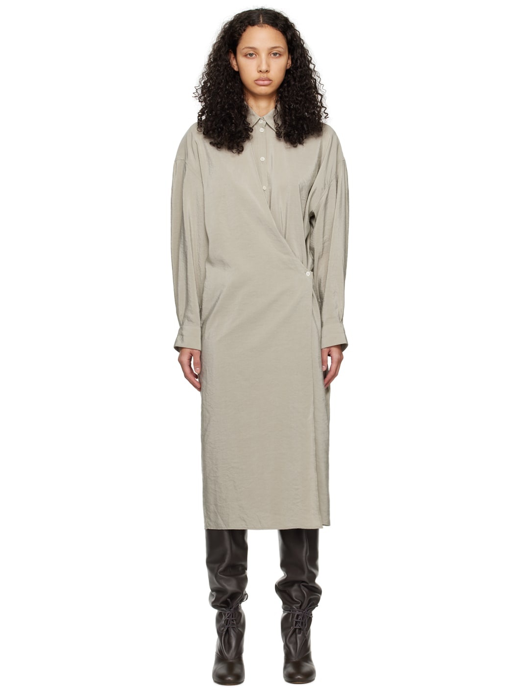 Crinkled silk-blend crepon dress. Button fastening at side seam for alternate styling. · Wrap construction · Spread collar · Button closure · Single-button barrel cuffs · Concealed self-tie fastening at waist · Corozo hardware Supplier color: Light misty gray