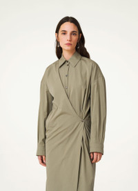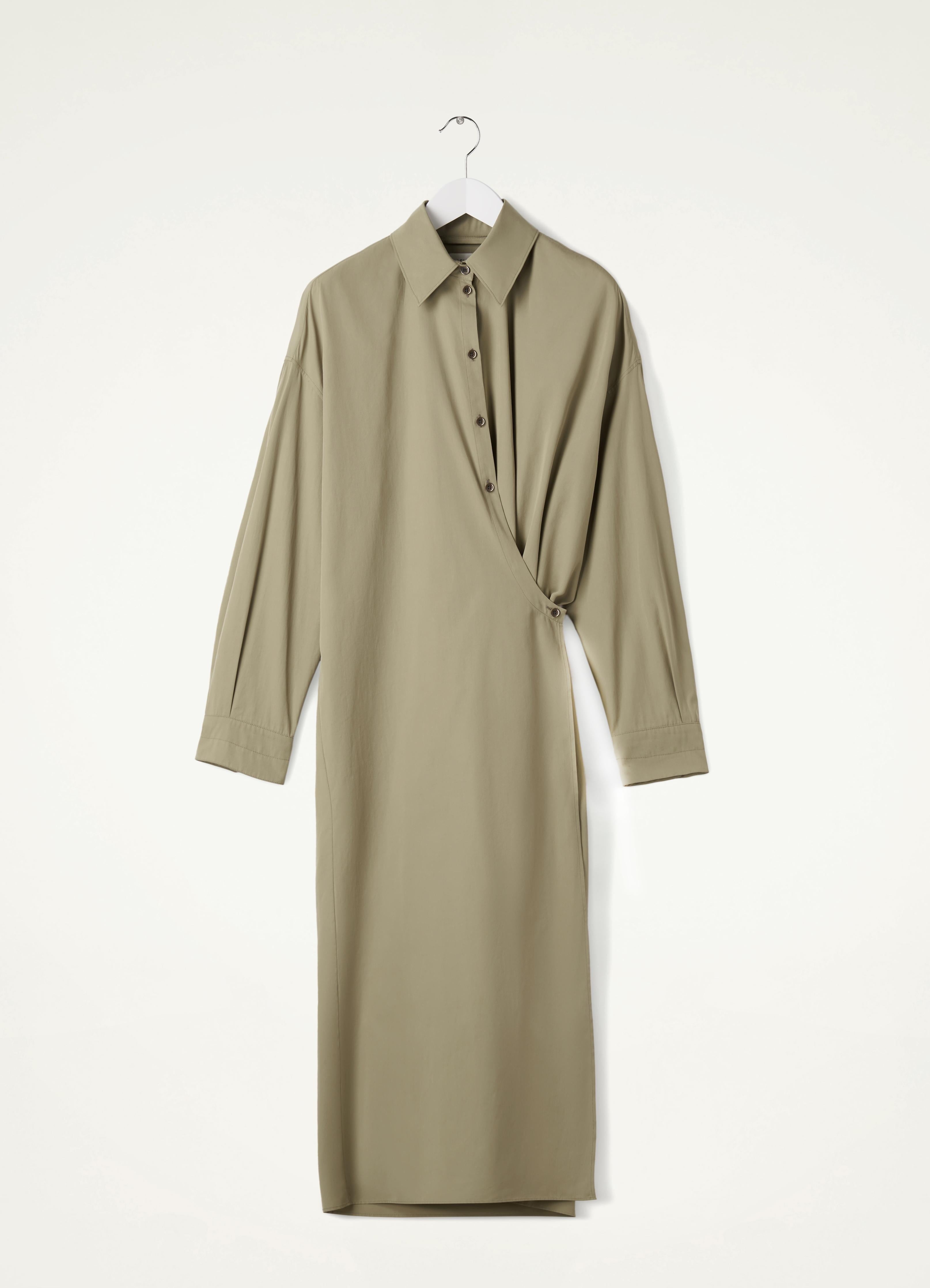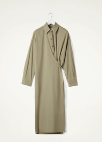 This dress is a staple of the LEMAIRE wardrobe. It is made of a cotton and silk blended poplin with a smooth, slightly shiny surface. Its details include a straight collar and an asymmetric button placket that closes over the hip, wrapping around the body from the waist to just below the knee. DETAILS Relaxed fit Straight collar Corozo buttons Below-the-knee length Adjustable angled cuffs Knotted inner tie Made in Romania Style : DR1024 LF1106 This model is 177 cm and is wearing a size 36/S FABRICS & CARE Main Fabric : 97% Coton, 3% Silk Soft wash 30°
