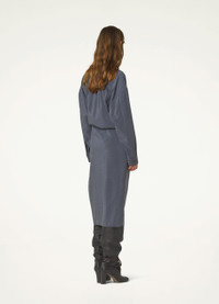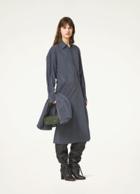 This dress is made of dry silk, a classic LEMAIRE fabric with a soft hand and tonic texture. Its details include a straight collar and an asymmetric button placket that closes over the hip, wrapping around the body from the waist to just below the knee. DETAILS Relaxed fit Straight collar Corozo buttons Below-the-knee length Adjustable angled cuffs Knotted inner tie Made in Romania Style : DR1024 LF208 This model is 178 cm and is wearing a size 36/S FABRICS & CARE Main Fabric : 76% Silk, 24% Polyamide/Nylon Soft wash 30° Do not bleach Do not tumble dry Cool ironing Soft dry clean