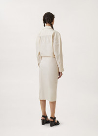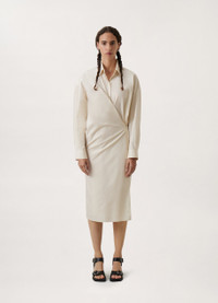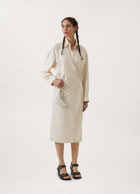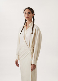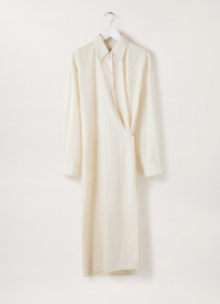 This dress is a staple of the LEMAIRE wardrobe. It is made of a cotton poplin that is lightweight with a satinlike finish. Its details include a straight collar and an asymmetric button placket that closes over the hip, wrapping around the body from the waist to just below the knee. DETAILS Motherofpearl buttons Belowtheknee length Adjustable angled cuffs Knotted inner tie Relaxed fit Made in Romania Style : DR1024 LF588 This model is 176 cm and is wearing a size 36/S (FR) FABRICS & CARE Main Material: 100% Cotton Soft wash 30° Do not bleach Do not tumble dry Cool ironing Soft dry clean