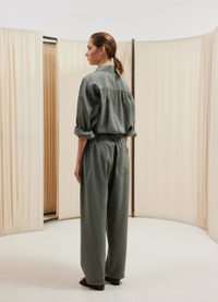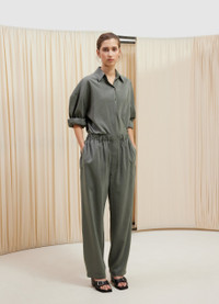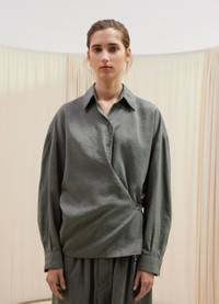 This shirt is part of the iconic Twisted family and a staple of LEMAIRE’s wardrobe. It is made of dry silk, a classic LEMAIRE fabric with a soft hand and tonic texture. Its details include a straight collar and an asymmetric button placket that closes over the hip, wrapping around the waist. DETAILS - Relaxed fit - Straight collar - Corozo buttons - Adjustable angled cuffs - Knotted inner tie Made in Romania Style: SH1032 LF208 FABRICS & CARE Main Fabric: 76% Silk / 24% Polyamide/Nylon Soft wash 30° Do not bleach Do not tumble dry Cool ironing Soft dry clean