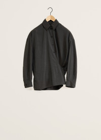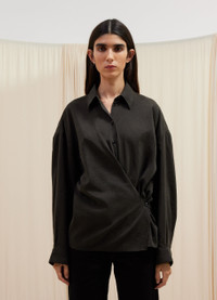 This shirt is part of the iconic Twisted family and a staple of LEMAIRE’s wardrobe. It is made of dry silk, a classic LEMAIRE fabric with a soft hand and tonic texture. Its details include a straight collar and an asymmetric button placket that closes over the hip, wrapping around the waist. DETAILS Relaxed fit - Straight collar - Corozo buttons - Adjustable angled cuffs - Knotted inner tie Made in Romania Style: SH1032 LF208 FABRICS & CARE Main Fabric: 76% Silk / 24% Polyamide/Nylon Soft wash 30° Do not bleach Do not tumble dry Cool ironing Soft dry clean