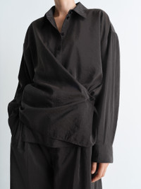 This shirt is part of the iconic Twisted family and a staple of LEMAIRE’s wardrobe. It is made of dry silk, a classic LEMAIRE fabric with a soft hand and tonic texture. Its details include a straight collar and an asymmetric button placket that closes over the hip, wrapping around the waist. DETAILS - Relaxed fit - Straight collar - Corozo buttons - Adjustable angled cuffs - Knotted inner tie Made in Romania Style: SH1141 LF1308 FABRICS & CARE Main Material: 76% Silk, 24% Nylon Soft wash 30° Do not bleach Do not tumble dry Cool ironing Soft dry clean