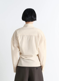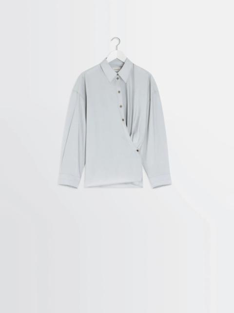 This shirt is part of the Twisted family emblematic of the Lemaire wardrobe. It is made from a washed cotton-silk blend with a light patina and a soft hand. DETAILS Twisted shirt in washed cotton silk blend Straight cut Shirt collar Long sleeves Straight buttoned cuffs Buttoned asymmetrical closure Interior closure with wrap-style tie Gathers at the back Made in Portugal Style : SH1141 LF1500 The model is 177 cm and is wearing a size 36 (S). FABRICS & CARE Main Material: 80% Cotton 20% Silk Do not wash Do not bleach Do not tumble dry Cool ironing Soft dry clean