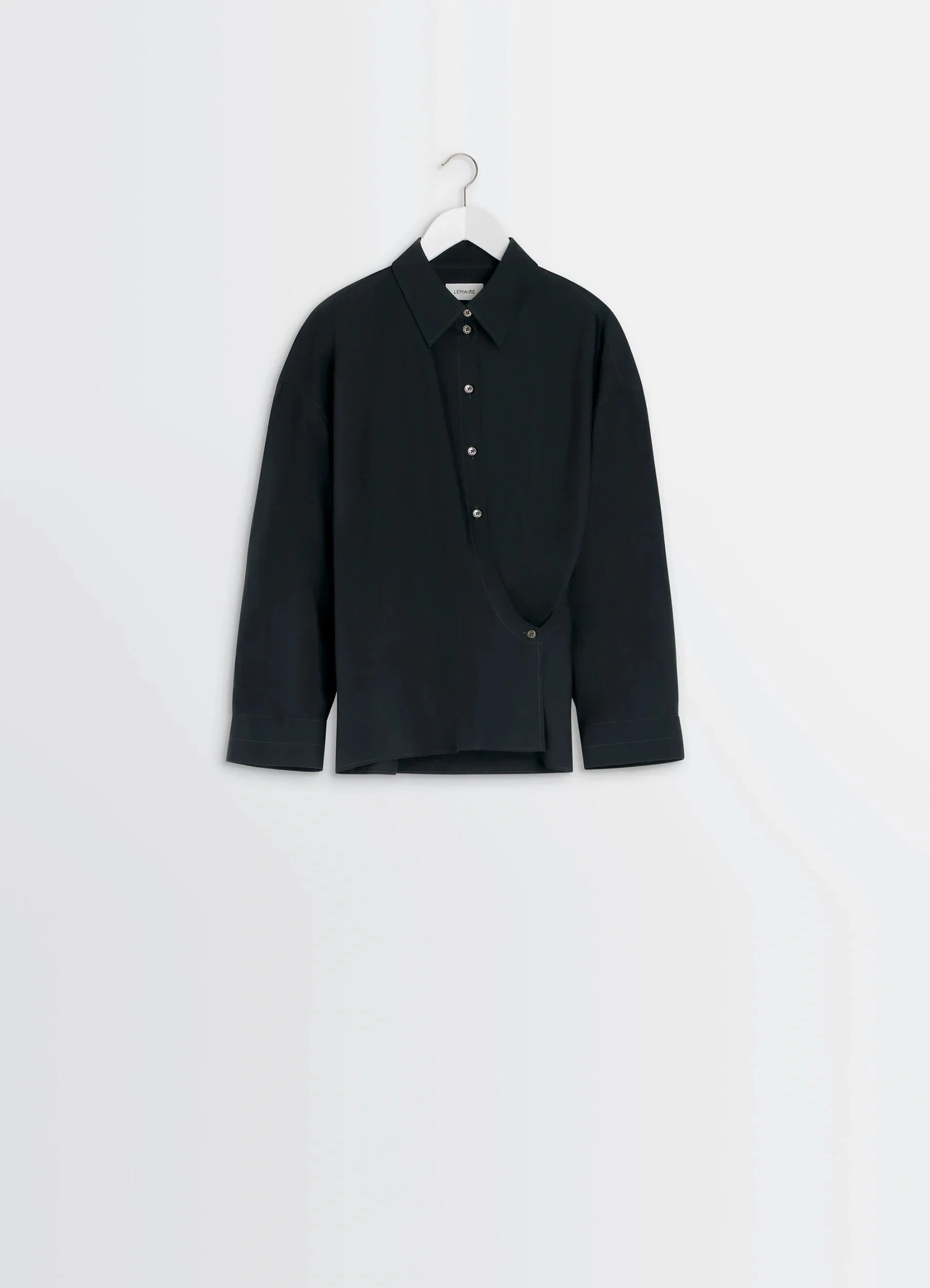 This shirt is part of the Twisted family emblematic of the Lemaire wardrobe. It is made from a washed cotton-silk blend with a light patina and a soft hand. DETAILS Twisted shirt in washed cotton silk blend Straight cut Shirt collar Long sleeves Straight buttoned cuffs Buttoned asymmetrical closure Interior closure with wrap-style tie Gathers at the back Made in Portugal Style : SH1141 LF1500 The model is 177 cm and is wearing a size 36 (S). FABRICS & CARE Main Material: 80% Cotton 20% Silk