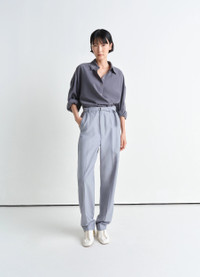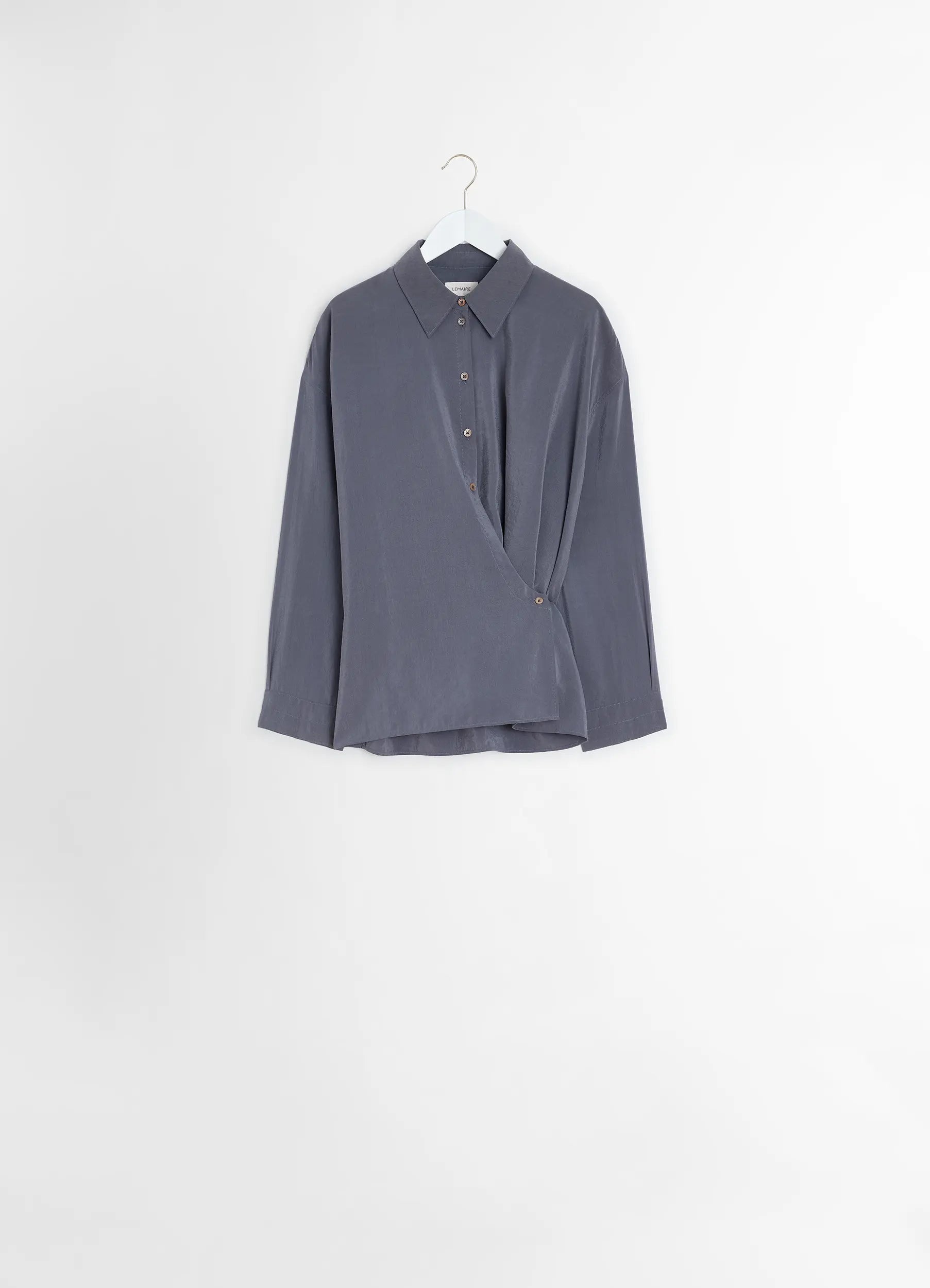 This shirt is part of the iconic Twisted family and a staple of LEMAIRE’s wardrobe. It is made of dry silk, a classic LEMAIRE fabric with a soft hand and tonic texture. Its details include a straight collar and an asymmetric button placket that closes over the hip, wrapping around the waist. DETAILS - Relaxed fit - Straight collar - Corozo buttons - Adjustable angled cuffs - Knotted inner tie Made in Romania Style: SH1141 LF1308 FABRICS & CARE Main Material: 76% Silk, 24% Nylon Soft wash 30° Do not bleach Do not tumble dry Cool ironing Soft dry clean