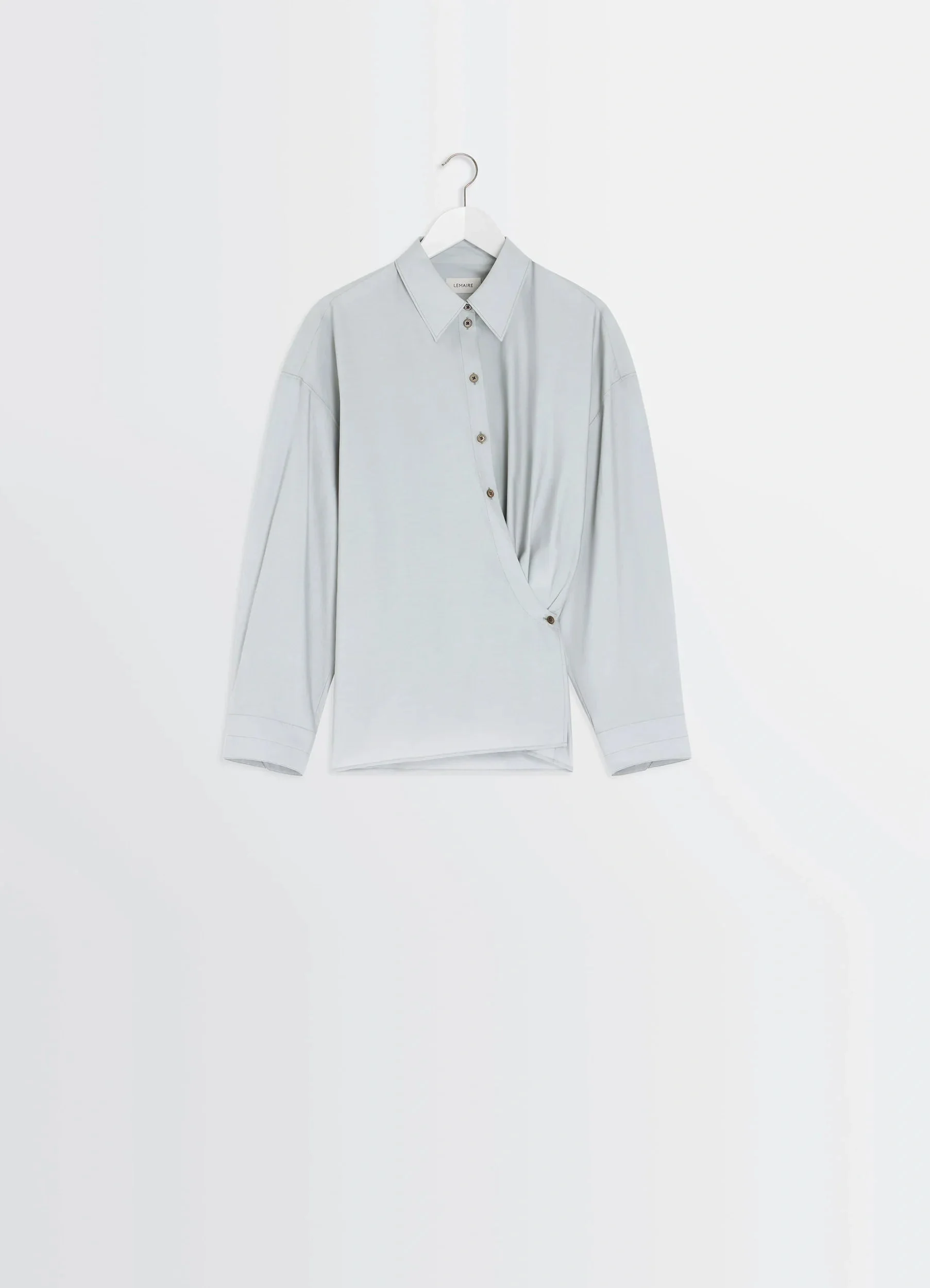 This shirt is part of the Twisted family emblematic of the Lemaire wardrobe. It is made from a washed cotton-silk blend with a light patina and a soft hand. DETAILS Twisted shirt in washed cotton silk blend Straight cut Shirt collar Long sleeves Straight buttoned cuffs Buttoned asymmetrical closure Interior closure with wrap-style tie Gathers at the back Made in Portugal Style : SH1141 LF1500 The model is 177 cm and is wearing a size 36 (S). FABRICS & CARE Main Material: 80% Cotton 20% Silk Do not wash Do not bleach Do not tumble dry Cool ironing Soft dry clean