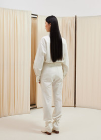 These pants are a new addition to LEMAIRE’s wardrobe. They are made in light cotton with a broken twill weave, providing a subtle, yet textural design. They include specific work with contrasted bias details emphasizing the waistline. The Straight Pants with Strings feature a single patched pocket at the back, two side pockets encircled by stitching and a small belt in contrasting colour which can be tied at the waist. At the ankles, strings allow the pants to be tightened, reducing the volume of the leg. Its hem is lined. DETAILS Straight fit Lined hem Drawstring at the waistline Ankle strings Bias at waistband Two side pockets A single patched pocket on the back Zip fly and hook Made in Portugal Style: PA1098 LF1253 FABRICS & CARE Main Material: 100% Cotton Main Lining: 100% Cotton Soft wash 30° Do not bleach Do not tumble dry Cool ironing Soft dry clean