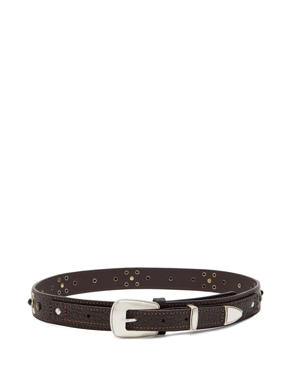 studded grained-leather belt Highlights - Dark brown - Textured finish - Stud embellishment - Contrast stitching - Silver-tone hardware - Buckle fastening Imported Composition Calf Leather 100%