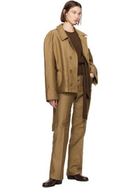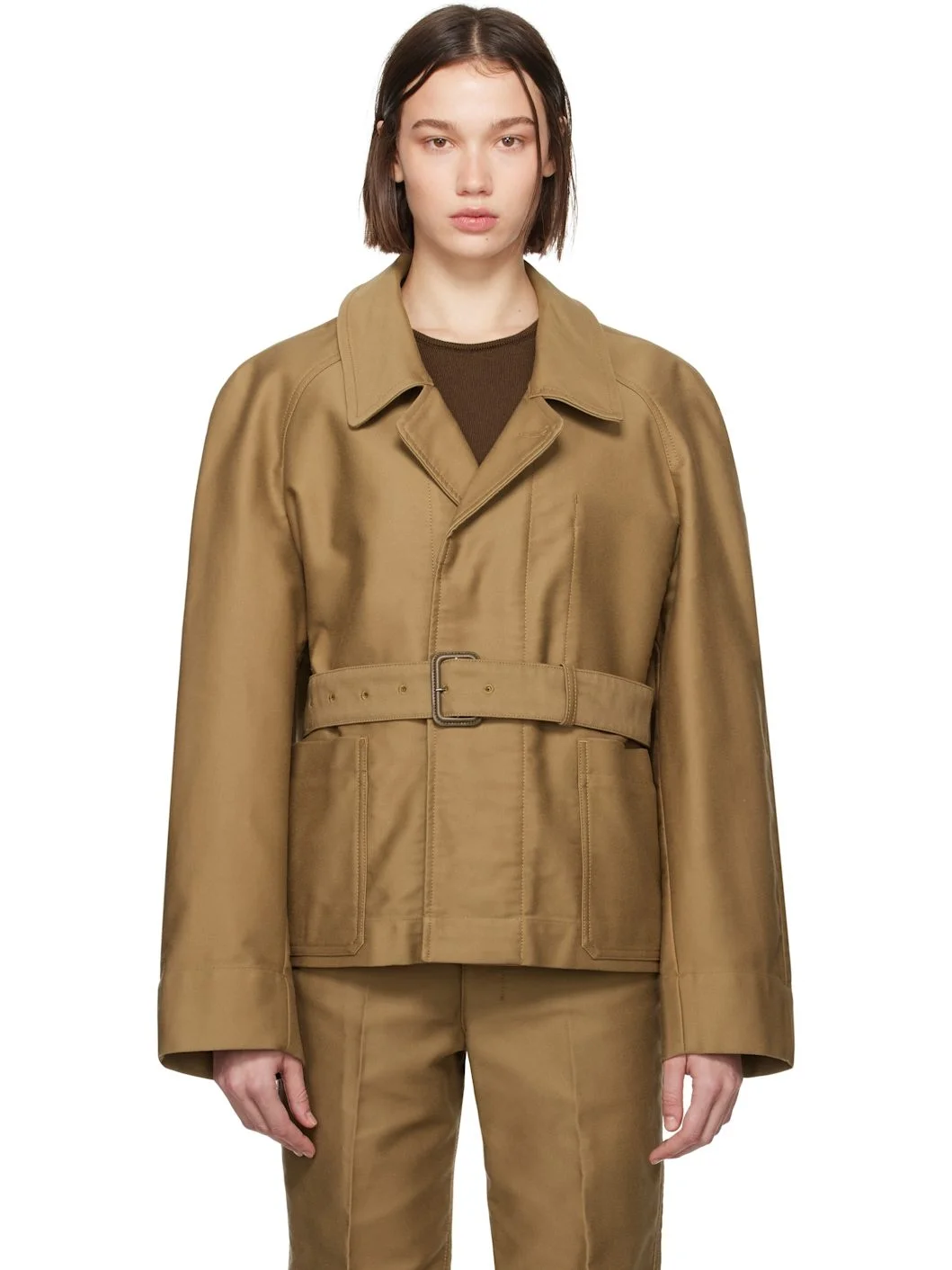 Heavyweight brushed cotton-blend sateen jacket. · Spread collar · Concealed button closure · Belt loops and detachable pin-buckle belt at waist · Patch pockets · Raglan sleeves · Central seam at back · Patch pocket at interior · Corozo hardware Supplier color: Camel Body: 65% cotton, 35% polyester. Lining: 100% cotton. Made in Morocco 242646F063000