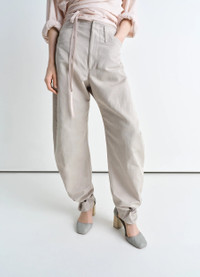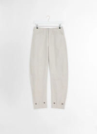 These Tapered Pants are crafted in cotton linen gabardine, a light and fluid fabric with a soft hand, perfect for the mid-season. They feature our signature curved leg with a more tapered silhouette, offering a feminine take on LEMAIRE'S twisted style. The narrower ankle and fitted waist enhance the shape, while diagonal front pockets, back pockets and tonal stitchings add utilitarian charm. Belt loops and adjustable buttons at the ankle allow for versatile styling, cinching the leg for a customized fit. DETAILS - Straight fit - Curved leg - Diagonal front pockets - Welt back pockets - Stitching details Made in Romania Style: PA1184 LF1350 The Model is 177cm / 5'9½'' ft and is wearing a size 36 (S). FABRICS & CARE Main Fabric: 60% Cotton, 40% Linen Main Lining: 51% Cotton, 49% Viscose Second Lining: 100% Cotton Hand wash Do not bleach Do not tumble dry Cool ironing Soft dry clean