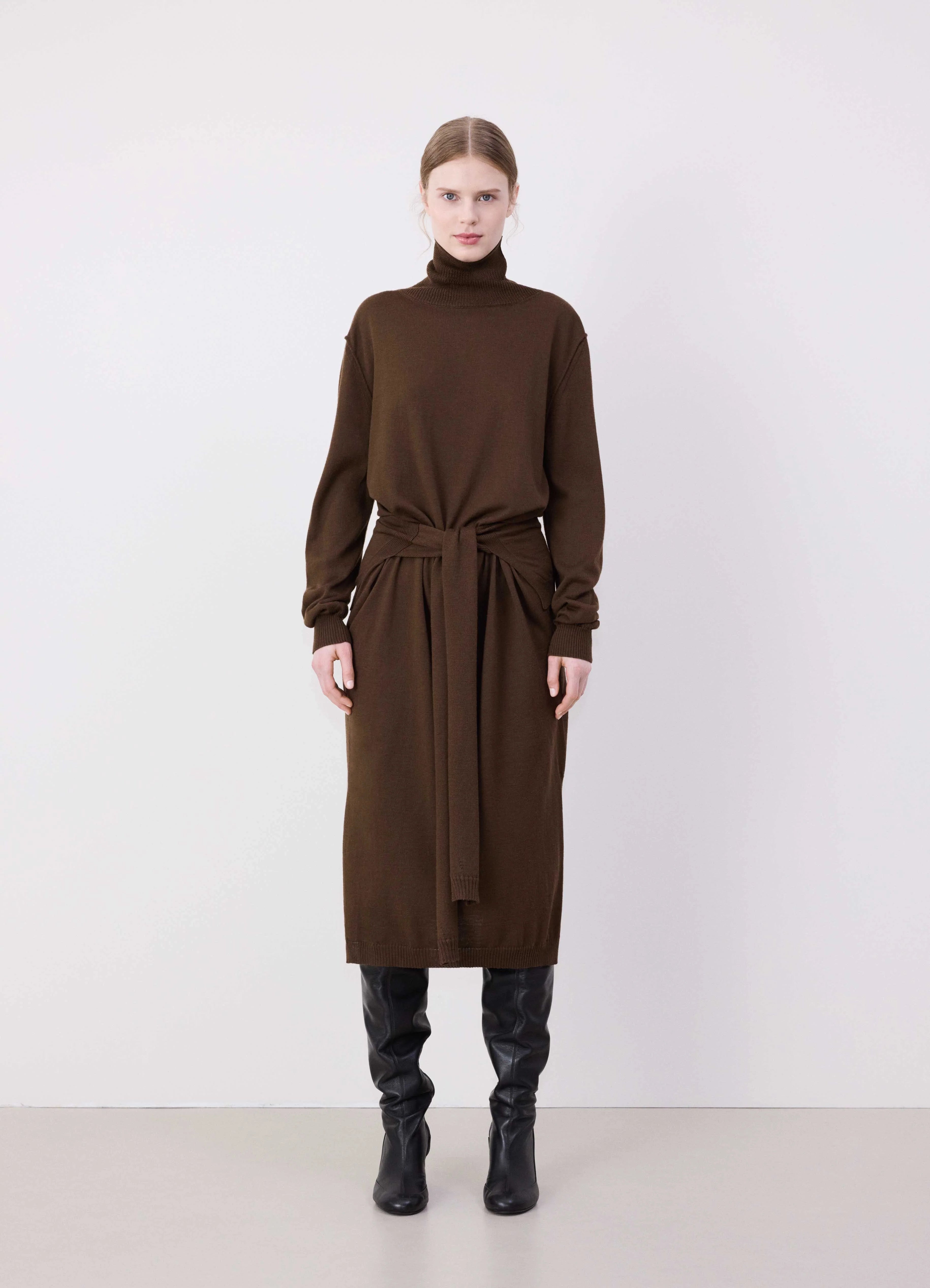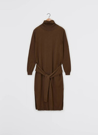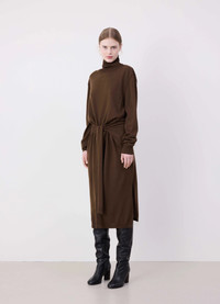 This dress is a new flexible design complementing the LEMAIRE vestiaire this season. The Trompe L’œil Dress is crafted in merino blend with a dry hand ans a slightly heathered appearance. This relaxed silhouette features a panel knitted at the waist, mimicking a jumper with sleeves to tie around the hip or to wear loose, in the same material as the dress. The ribbed high neck has a relaxed fit and the seams at the armholes and the waist are reversible. The cuffs at the sleeves are also ribbed, borrowing and deconstructing the codes of the classic jumper. DETAILS - Relaxed fit - Ribbed high neck - Jumper panel at the waist - Ribbed cuffs Made in Portugal Style: DR1082 LK087 FABRICS & CARE Main Fabric: 50% Wool / 50% Acrylic Hand wash Do not bleach Do not tumble dry Cool ironing Soft dry clean Dry flat