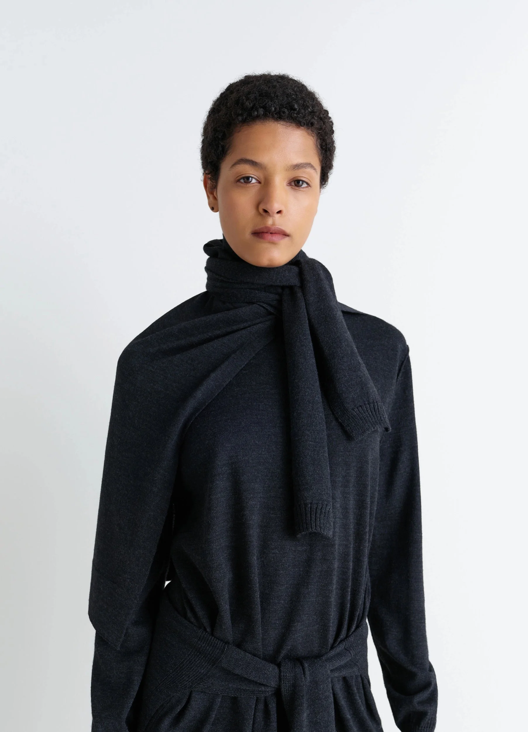 This trompe-l'œil scarf is part of an evolving, modular wardrobe reflecting Lemaire's love of layering. It is knitted in a blended merino wool that is both dry and supple. DETAILS Trompe l’œil scarf in merino wool blend Fine knit model to drape Sleeve-style side panels to tie Rib-knit trim Made in Portugal Style : AC1253 LK087 CARE Main fabric: 50% acrylic, 50% wool Hand wash Do not bleach Do not tumble dry Cool ironing Soft dry clean Dry flat