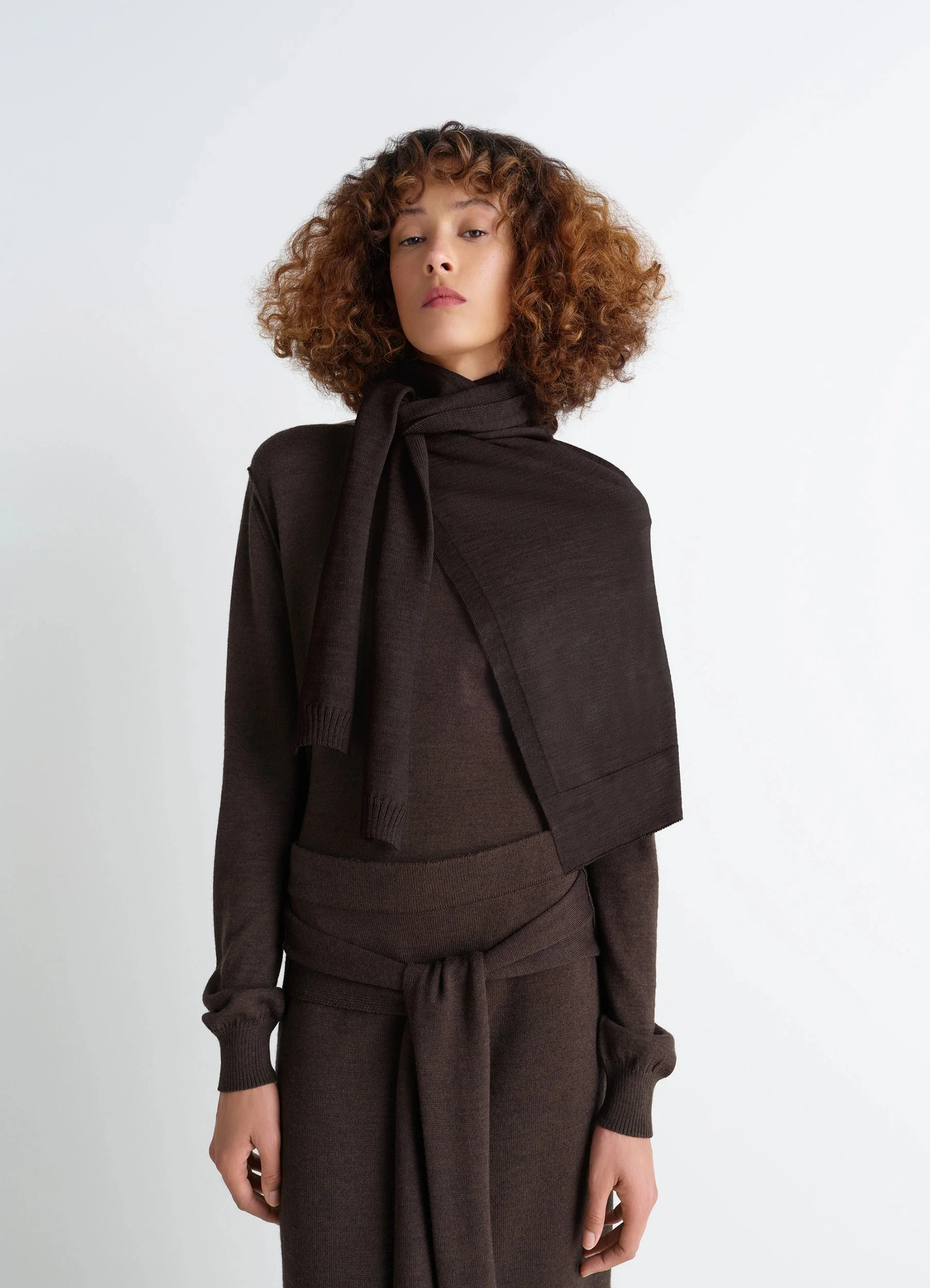This trompe-l'œil scarf is part of an evolving, modular wardrobe reflecting Lemaire's love of layering. It is knitted in a blended merino wool that is both dry and supple. DETAILS Trompe l’œil scarf in merino wool blend Fine knit model to drape Sleeve-style side panels to tie Rib-knit trim Made in Portugal Style : AC1253 LK087 CARE Main fabric: 50% acrylic, 50% wool Hand wash Do not bleach Do not tumble dry Cool ironing Soft dry clean Dry flat