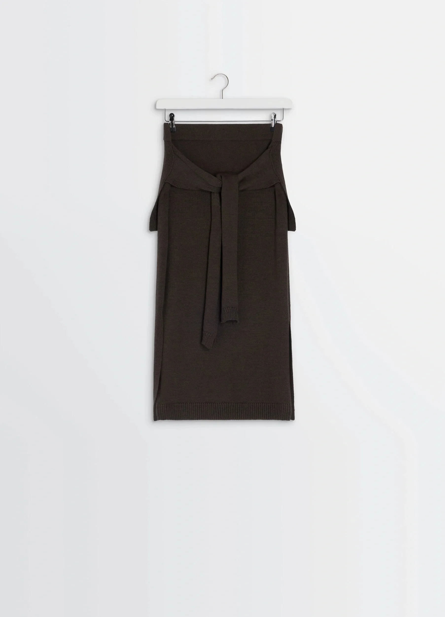 This trompe-l'œil skirt is part of an evolving, modular wardrobe that reflects Lemaire's love for movement. Featuring sweater-style tie-around panels at the back, it's knitted in a blended merino wool that's both dry and soft. The model is 177 cm tall and is wearing a size 36 (S). This trompe-l'œil skirt is part of an evolving, modular wardrobe that reflects Lemaire's love for movement. Featuring sweater-style tie-around panels at the back, it's knitted in a blended merino wool that's both dry and soft. The model is 177 cm tall and is wearing a size 36 (S). DETAILS Trompe l’œil skirt in merino wool blend Fitted cut Midi-length Ribbed waistband Trompe-l’oeil sweater-style back panels Side slits Rib-knit trim Made in Portugal Style : SK1058 LK087 Trompe l’œil skirt in merino wool blend Fitted cut Midi-length Ribbed waistband Trompe-l’oeil sweater-style back panels Side slits Rib-knit trim Made in Portugal Style : SK1058 LK087 CARE Main Material: 50% Acrylic 50% Wool Hand wash Do not bleach Do not tumble dry Cool ironing Soft dry clean Dry flat Main Material: 50% Acrylic 50% Wool Hand wash Do not bleach Do not tumble dry Cool ironing Soft dry clean Dry flat