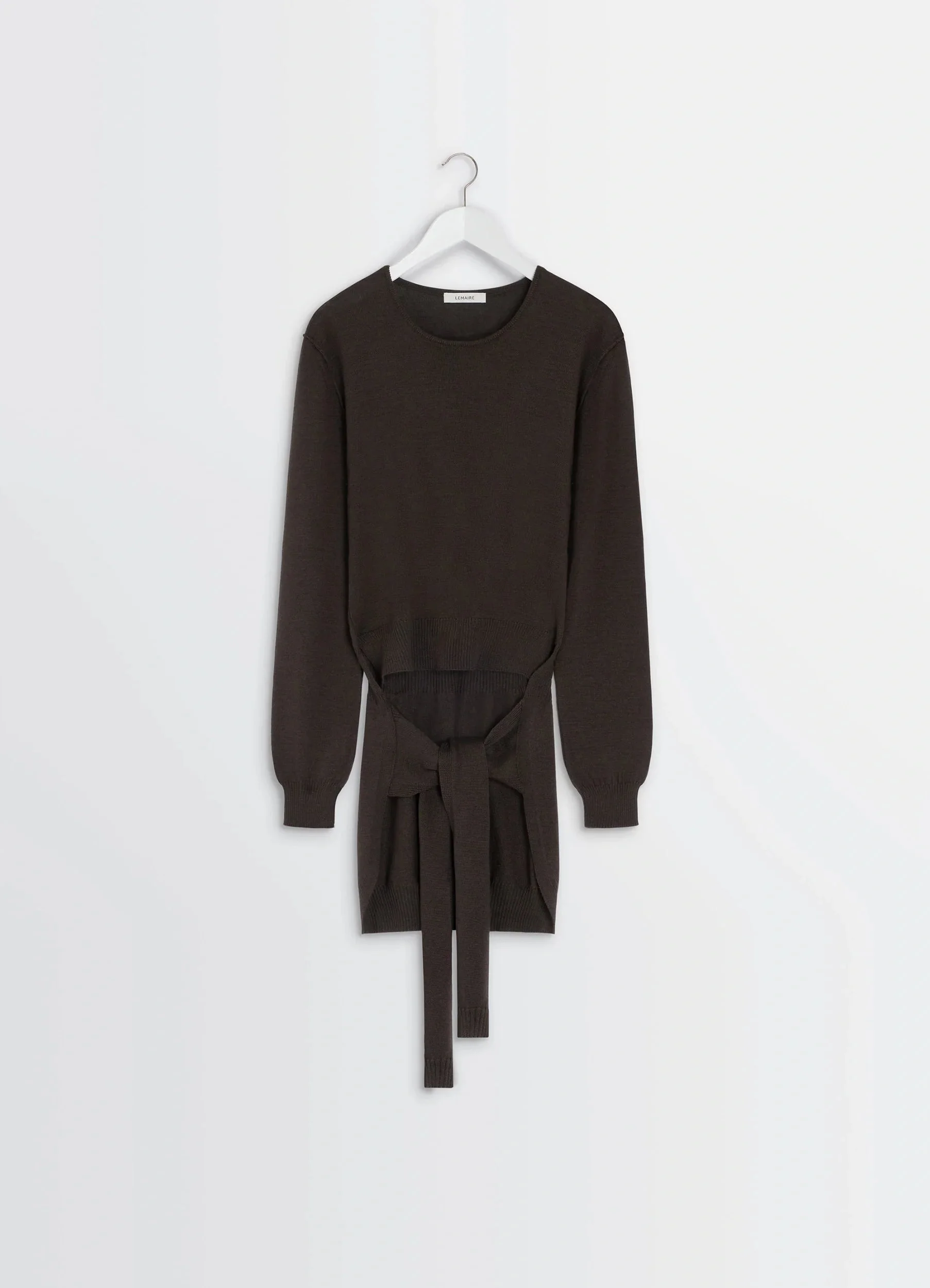 This trompe-l'œil jumper is part of an evolving, modular wardrobe that reflects Lemaire's love for movement. Featuring sweater-style tie-around panels at the back, it is knitted in a blended merino wool that is both dry and soft. The model is 177 cm and is wearing a size 36 (S). This trompe-l'œil jumper is part of an evolving, modular wardrobe that reflects Lemaire's love for movement. Featuring sweater-style tie-around panels at the back, it is knitted in a blended merino wool that is both dry and soft. The model is 177 cm and is wearing a size 36 (S). DETAILS Trompe l’œil crewneck jumper in merino wool blend Trompe-l’oeil asymmetrical straight cut Crewneck Visible shoulder and armhole seams Long sleeves Trompe-l’oeil sweater-style back panels Rib-knit trim Made in Portugal Style : TO1434 LK1045 Trompe l’œil crewneck jumper in merino wool blend Trompe-l’oeil asymmetrical straight cut Crewneck Visible shoulder and armhole seams Long sleeves Trompe-l’oeil sweater-style back panels Rib-knit trim Made in Portugal Style : TO1434 LK1045 CARE Main Material: 50% Acrylic 50% Wool Hand wash Do not bleach Do not tumble dry Cool ironing Soft dry clean Dry flat Main Material: 50% Acrylic 50% Wool Hand wash Do not bleach Do not tumble dry Cool ironing Soft dry clean Dry flat