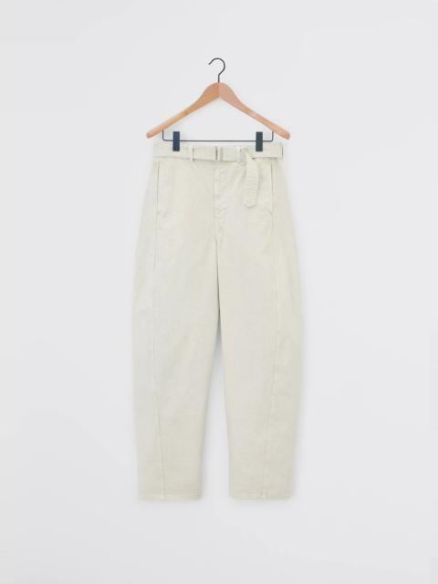 These unisex pants are a LEMAIRE classic and an interpretation of the iconic Twisted Pants. They are made in heavy denim - a staple fabric of LEMAIRE’s wardrobe - with a visible twill weave and a deep wash allowing a unique effect on colour. Their side-seams are slightly twisted giving the leg a curved shape. Details include two side pockets, back patch pockets and contrast stitching. The fit is elongated and mid-rise and includes a matching belt to adjust the waist. DETAILS - Regular fit - Removable matching belt with metal buckle - Contrast stitching Made in Morocco Style: PA326 LD1007 FABRICS & CARE Main Material: 100% Cotton Main Lining: 100% Cotton Soft wash 30° Do not bleach Do not tumble dry Cool ironing Soft dry clean