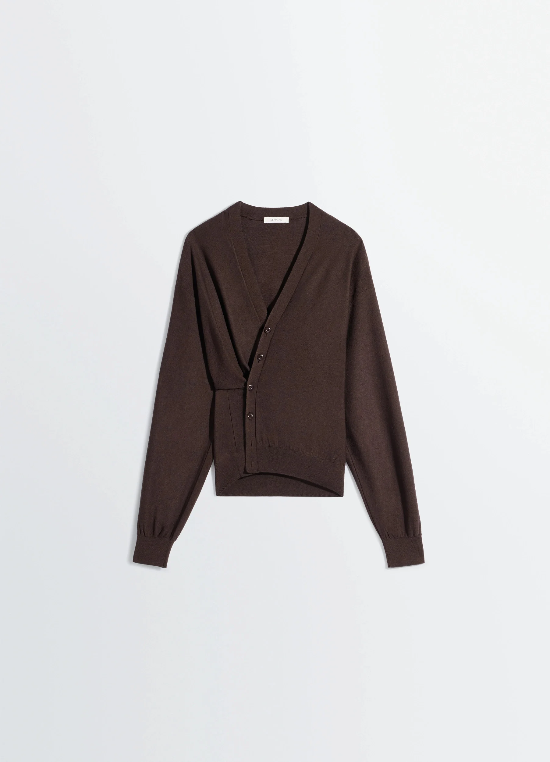 Part of the Twisted family emblematic of the Lemaire wardrobe, this casual cardigan features an asymmetrical button placket that closes at the side seam, wrapping around the waist. It is knitted in a blended merino wool that is both dry and soft. The models are 177 cm and 187 cm and are wearing sizes 36 (S) and 48 (M). Part of the Twisted family emblematic of the Lemaire wardrobe, this casual cardigan features an asymmetrical button placket that closes at the side seam, wrapping around the waist. It is knitted in a blended merino wool that is both dry and soft. The models are 177 cm and 187 cm and are wearing sizes 36 (S) and 48 (M). DETAILS Twisted cardigan in merino wool blend V-neck Button closure Side buttons for asymmetrical closure Long sleeves Rib-knit trim Made in Portugal Style : PO0023 LK087 Twisted cardigan in merino wool blend V-neck Button closure Side buttons for asymmetrical closure Long sleeves Rib-knit trim Made in Portugal Style : PO0023 LK087 CARE Main Material: 50% Acrylic 50% Wool Hand wash Do not bleach Do not tumble dry Cool ironing Soft dry clean Dry flat Main Material: 50% Acrylic 50% Wool Hand wash Do not bleach Do not tumble dry Cool ironing Soft dry clean Dry flat