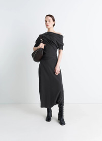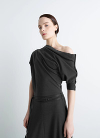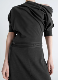 Inspired by Lemaire's taste for the link between comfort and elegance, this twisted hem dress is crafted in wool and viscose-blend interlock jersey, a dense yet fluid material offering a slender, draped silhouette. The model is 177 cm and is wearing a size 36 (S). DETAILS Twisted hem dress in wool viscose interlock blend Draped and fitted cut Midi-length Asymmetrical neckline Cotton braids on sleeves, with rivet detail at bottom of sleeves Ribbed short sleeves Side belt loops Cotton belt, adjustable with rings Twisted hem Made in Portugal Style : DR1126 LJ1041 CARE Main Material: 43% Wool 38% Viscose 14% Polyamide 5% Elasthanne Second Material: 100% Cotton Hand wash Do not bleach Do not tumble dry Cool ironing Do not dry clean Dry flat Wash and iron upside down