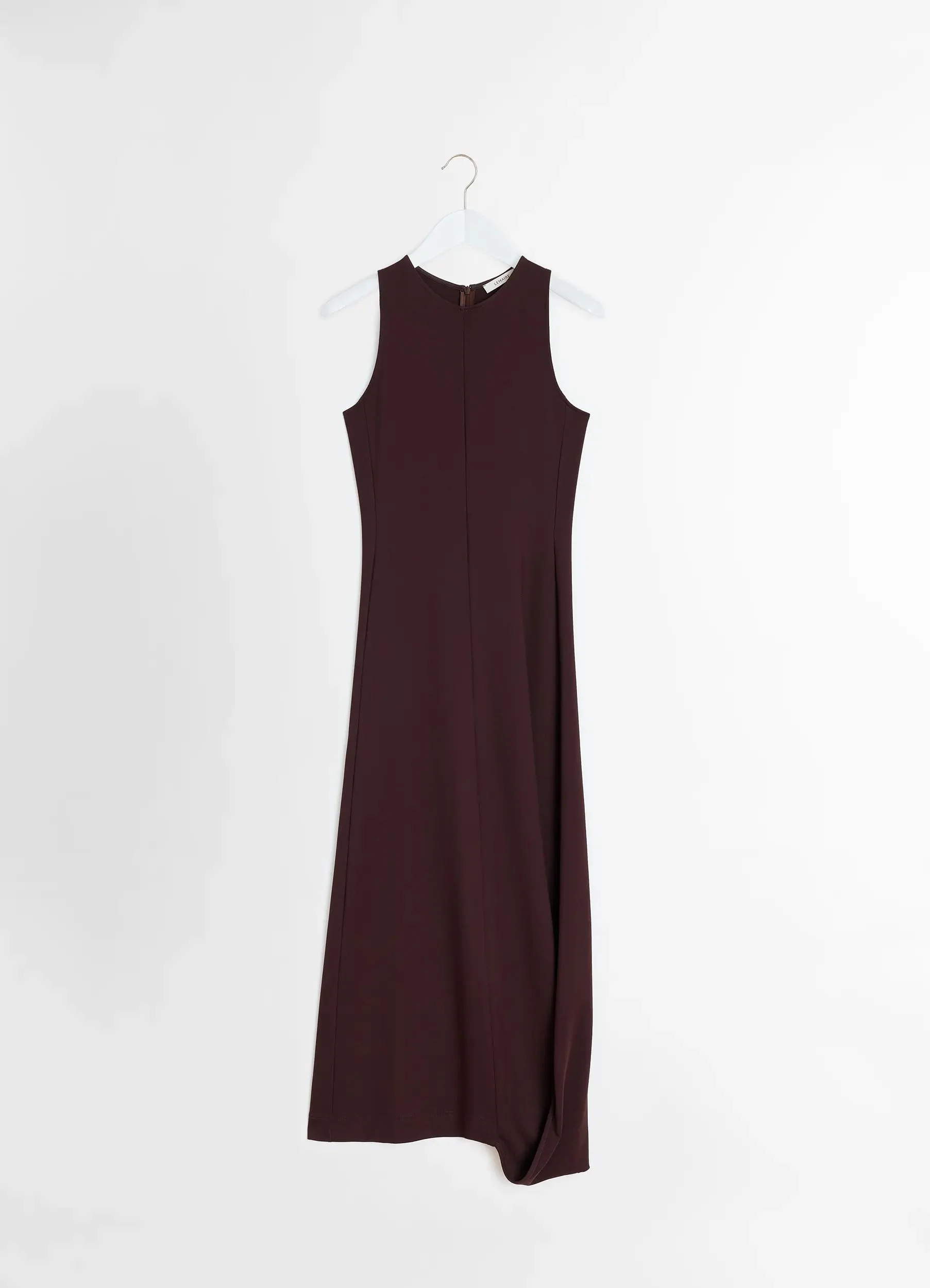This long sleeveless dress is crafted from a blend of viscose and silk with a soft hand, that contours the body for a close yet comfortable fit. It features a classic crew neck and an invisible zip closure at the center back. The standout detail lies on the bottom half of the dress, where a slit opens up into a cut-out, creating a unique way of slipping into the dress. The design is completed with cotton binding details on the inside, adding a refined touch to its minimalist elegance. DETAILS - Fitted shape - Midi length - Crew neck - Sleeveless - Slit detail at the calves - Coton lining details Made in Portugal Style: DR1106 LJ1034 FABRICS & CARE Main Fabric: 80% Viscose, 16% Silk, 4% Elastane Soft wash 30° Do not bleach Do not tumble dry Cool ironing Do not dry clean Dry flat