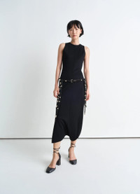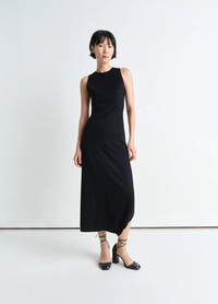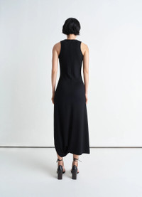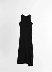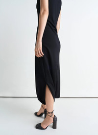 This long sleeveless dress is crafted from a blend of viscose and silk with a soft hand, that contours the body for a close yet comfortable fit. It features a classic crew neck and an invisible zip closure at the center back. The standout detail lies on the bottom half of the dress, where a slit opens up into a cut-out, creating a unique way of slipping into the dress. The design is completed with cotton binding details on the inside, adding a refined touch to its minimalist elegance. DETAILS - Fitted shape - Midi length - Crew neck - Sleeveless - Slit detail at the calves - Coton lining details Made in Portugal Style: DR1106 LJ1034 FABRICS & CARE Main Fabric: 80% Viscose, 16% Silk, 4% Elastane Soft wash 30° Do not bleach Do not tumble dry Cool ironing Do not dry clean Dry flat
