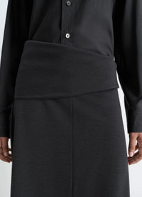 Inspired by Lemaire's taste for the link between comfort and elegance, this twisted hem dress is crafted in wool and viscose-blend interlock jersey, a dense yet fluid material offering a slender, draped silhouette. The model is 177 cm and is wearing a size 36 (S). Inspired by Lemaire's taste for the link between comfort and elegance, this twisted hem dress is crafted in wool and viscose-blend interlock jersey, a dense yet fluid material offering a slender, draped silhouette. The model is 177 cm and is wearing a size 36 (S). DETAILS Twisted hem skirt in wool viscose interlock blend Draped and fitted cut Midi-length Twisted hem Side metal zip closure Made in Portugal Style : SK1060 LJ1041 Twisted hem skirt in wool viscose interlock blend Draped and fitted cut Midi-length Twisted hem Side metal zip closure Made in Portugal Style : SK1060 LJ1041 CARE Main Material: 43% Wool 38% Viscose 14% Polyamide 5% Elasthanne Hand wash Do not bleach Do not tumble dry Cool ironing Do not dry clean Dry flat Wash and iron upside down Main Material: 43% Wool 38% Viscose 14% Polyamide 5% Elasthanne Hand wash Do not bleach Do not tumble dry Cool ironing Do not dry clean Dry flat Wash and iron upside down
