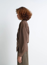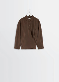 This shirt is part of the Twisted family emblematic of the Lemaire wardrobe. It is crafted in a dry silk blend, a classic house fabric with a soft hand and slightly crinkled texture. DETAILS Twisted shirt in a dry silk blend Straight cut Shirt collar Long sleeves Straight buttoned cuffs Buttoned asymmetrical closure Interior closure with wrap-style tie Gathers at the back Made in Romania Style : SH1141 LF1308 The model is 177 cm and is wearing a size 36 (S). FABRICS & CARE Main Material: 76% Silk 24% Polyamide