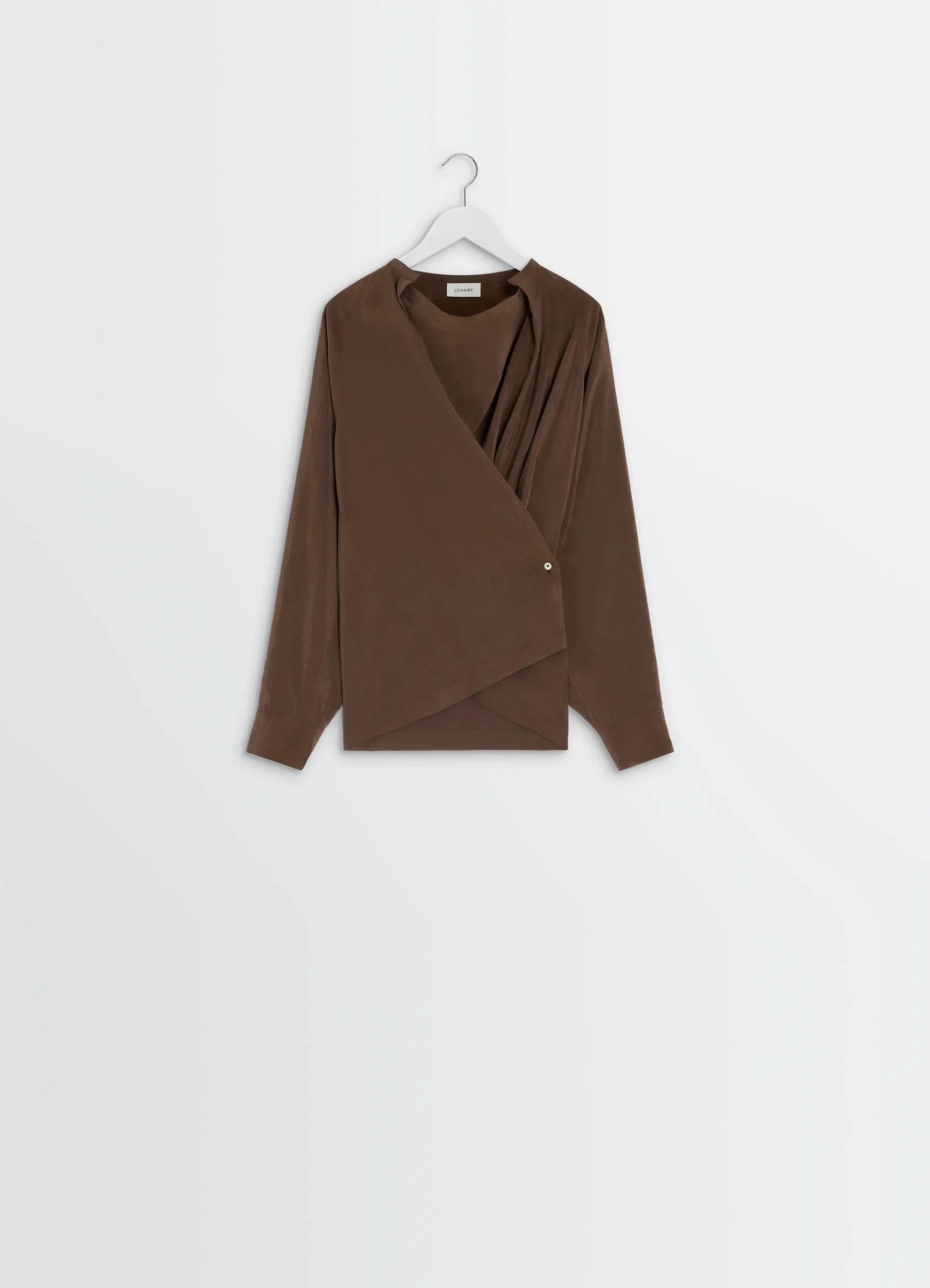 This long-sleeved top is part of the Twisted family emblematic of the Lemaire wardrobe. It is crafted in a dry silk blend, a classic house fabric with a soft hand and slightly crinkled texture. DETAILS Twisted top in dry silk Casual flowing cut Crewneck with side pleats Long raglan sleeves Straight buttoned cuffs Front pleat with buttonhole Lacquered buton on the side Made in Romania Style : TO1081 LF1308 The model is 177 cm and is wearing a size 36 (S). FABRICS & CARE Main Material: 76% Silk 24% Polyamide