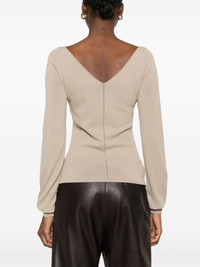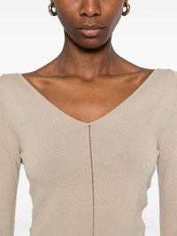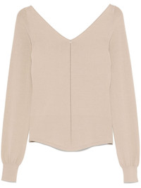 V-neck top Highlights - Sand beige - Ribbed cuffs - Long sleeves - V-back Made in Italy Composition Viscose 75%, Polyamide 25% SIZE & FIT Model measurements Height 5 ft 10 in(1.78 m) Bust/Chest 31.49 in(80 cm) Hips 37 in(94 cm) Waist 23.62 in(60 cm) FittingInformation Designed for a close fit throughout Made with a lightweight knit, this piece offers some stretch