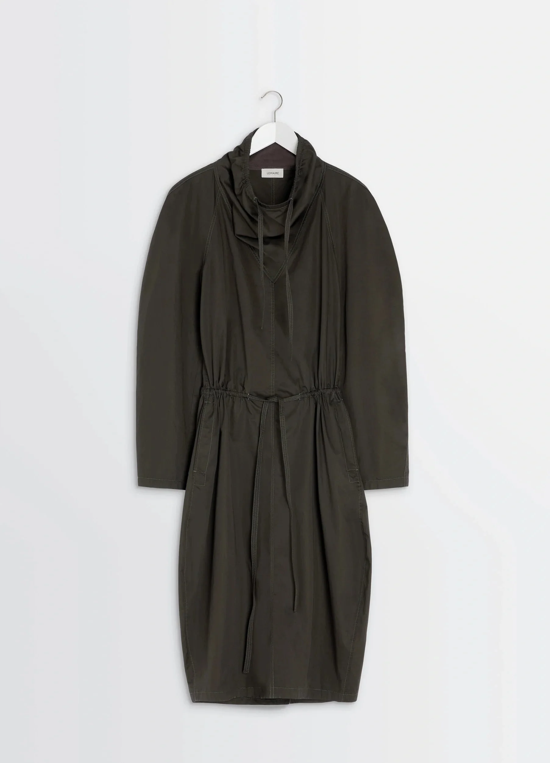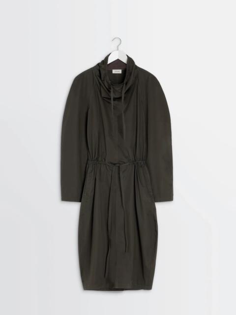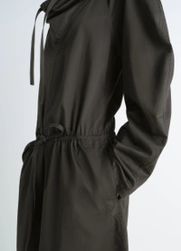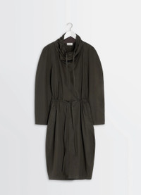 This vareuse dress reflects Lemaire's love for workwear and archetypal pieces. This emblematic piece is reinterpreted here in a lightweight cotton whose satin finish will develop a patina over time. The model is 177 cm and is wearing a size 36 (S). This vareuse dress reflects Lemaire's love for workwear and archetypal pieces. This emblematic piece is reinterpreted here in a lightweight cotton whose satin finish will develop a patina over time. The model is 177 cm and is wearing a size 36 (S). DETAILS Vareuse dress in light cotton satin Relaxed cut High neck with drawcord Long raglan sleeves Adjustable waist with drawstring channel and drawcord Side pockets Round-shaped skirt Back vent Cotton flannel-lined collar Made in Romania Style : DR1116 LF1207 Vareuse dress in light cotton satin Relaxed cut High neck with drawcord Long raglan sleeves Adjustable waist with drawstring channel and drawcord Side pockets Round-shaped skirt Back vent Cotton flannel-lined collar Made in Romania Style : DR1116 LF1207 CARE Main Material: 100% Cotton Main Lining: 100% Cotton Soft wash 30° Do not bleach Do not tumble dry Cool ironing Soft dry clean Main Material: 100% Cotton Main Lining: 100% Cotton Soft wash 30° Do not bleach Do not tumble dry Cool ironing Soft dry clean