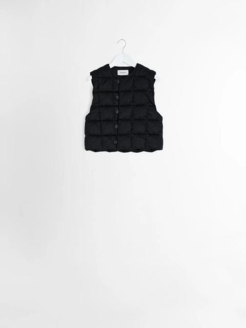 This is a new interpretation of a LEMAIRE classic. The Wadded Gilet is crafted in light cotton satin, offering a soft touch and fluid texture with a subtle sheen. It fastens via a series of corozo buttons to close with straps, all the way up to the wadded stand collar, and the placket is reinforced by a contrast topstitching detailing. It features two wadded patch pockets on the sides and a patch pocket inside. A comforting piece to wear on its own or layered, this gilet has generous armholes and is fully lined in the same soft material as its outside shell. DETAILS - Relaxed fit - Wadded stand collar - Corozo buttons - Patch pockets - Inside pocket - Fully lined Made in Romania Style: OW1032 LF1207 The Model is 180cm / 5' 11" ft and is wearing a size 36 (S). FABRICS & CARE Main Fabric: 100% Cotton Main Lining: 100% Cotton Trims: 100% Polyester Do not wash Do not bleach Do not tumble dry Do not iron Soft dry clean Discover the traceability