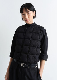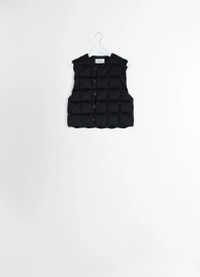 This is a new interpretation of a LEMAIRE classic. The Wadded Gilet is crafted in light cotton satin, offering a soft touch and fluid texture with a subtle sheen. It fastens via a series of corozo buttons to close with straps, all the way up to the wadded stand collar, and the placket is reinforced by a contrast topstitching detailing. It features two wadded patch pockets on the sides and a patch pocket inside. A comforting piece to wear on its own or layered, this gilet has generous armholes and is fully lined in the same soft material as its outside shell. DETAILS - Relaxed fit - Wadded stand collar - Corozo buttons - Patch pockets - Inside pocket - Fully lined Made in Romania Style: OW1032 LF1207 The Model is 176cm / 5' 9½'' ft and is wearing a size 36 (S). FABRICS & CARE Main Fabric: 100% Cotton Main Lining: 100% Cotton Trims: 100% Polyester Do not wash Do not bleach Do not tumble dry Do not iron Soft dry clean Discover the traceability