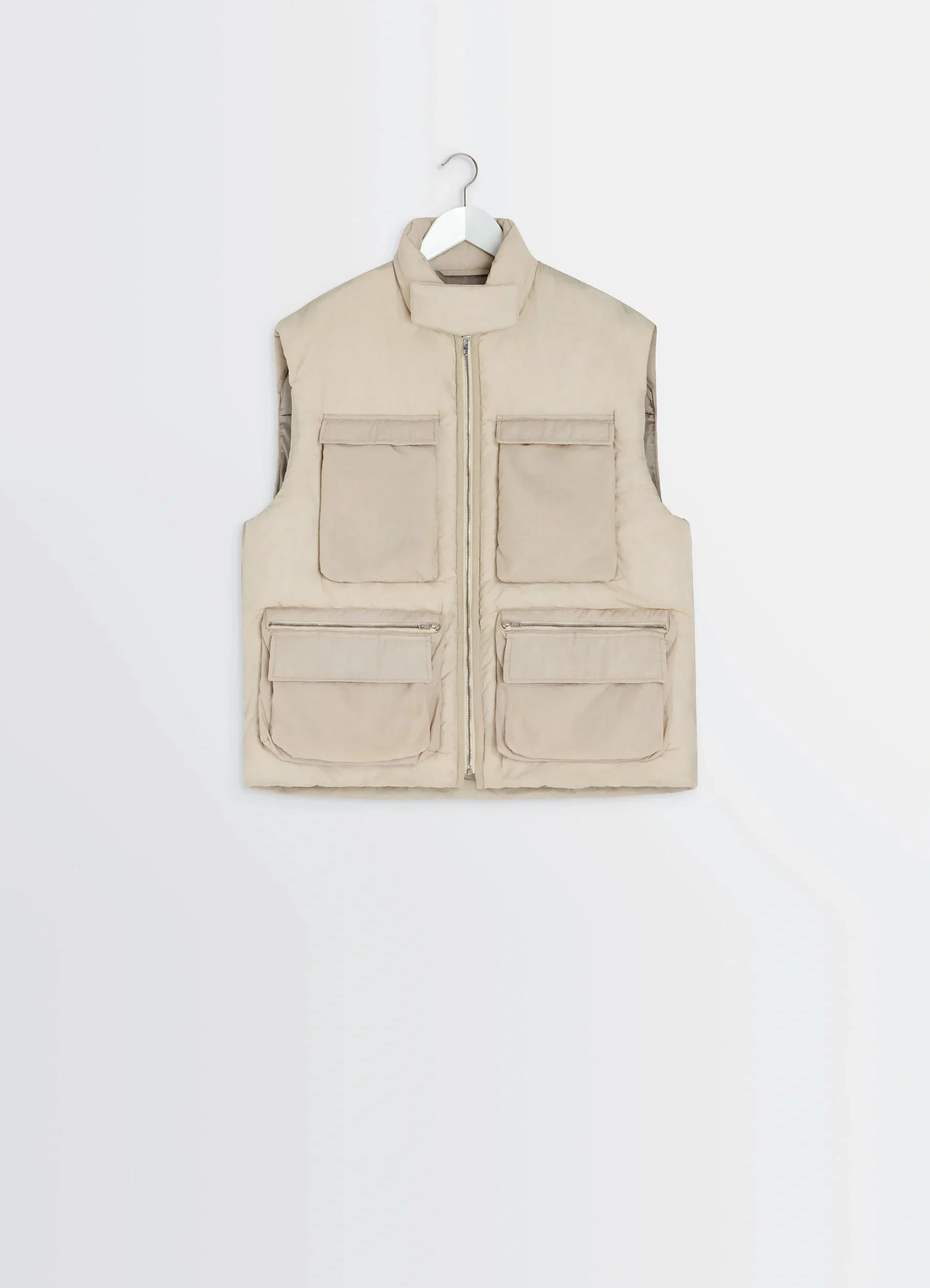 This wadded gilet is made from lightweight, water-repellent nylon. With gusseted pockets and snap flaps, it is in keeping with Lemaire's utilitarian aesthetic. The model is 177 cm tall and is wearing a size 36 (S). This wadded gilet is made from lightweight, water-repellent nylon. With gusseted pockets and snap flaps, it is in keeping with Lemaire's utilitarian aesthetic. The model is 177 cm tall and is wearing a size 36 (S). DETAILS Wadded gilet in lightweight, water-repellent nylon Oversized cut Fully lined model Stand-up collar with snap chin strap Zipper and snap closure Patch pockets with snap flaps and zipped front pockets Herringbone ribbon trim Inside patch pockets Made in Romania Style : OW1155 LF1301 Wadded gilet in lightweight, water-repellent nylon Oversized cut Fully lined model Stand-up collar with snap chin strap Zipper and snap closure Patch pockets with snap flaps and zipped front pockets Herringbone ribbon trim Inside patch pockets Made in Romania Style : OW1155 LF1301 CARE Main Material: 100% Polyamide Main Lining: 56% Cotton 44% Viscose Second Lining: 100% Cotton Third Lining: 100% Cotton Trim: 100% Polyester Do not wash Do not bleach Do not tumble dry Cool ironing Soft dry clean Main Material: 100% Polyamide Main Lining: 56% Cotton 44% Viscose Second Lining: 100% Cotton Third Lining: 100% Cotton Trim: 100% Polyester Do not wash Do not bleach Do not tumble dry Cool ironing Soft dry clean