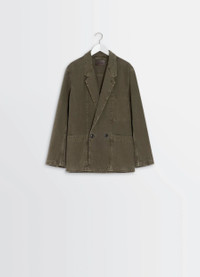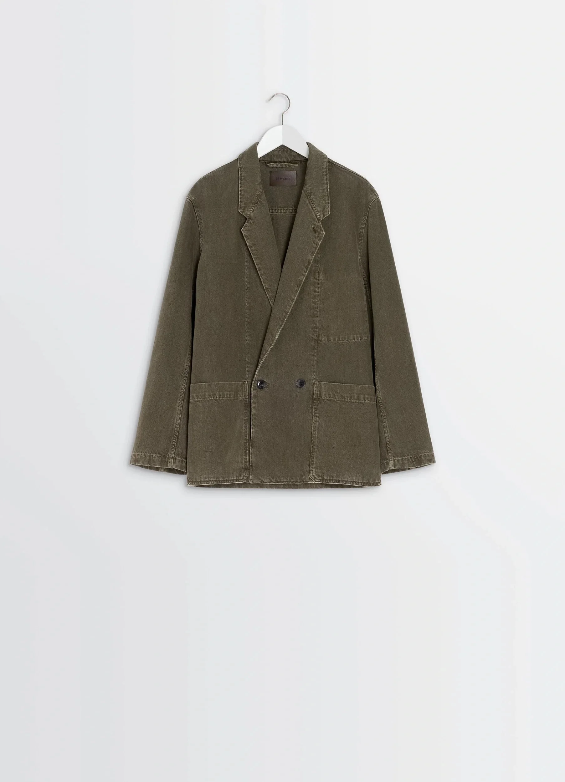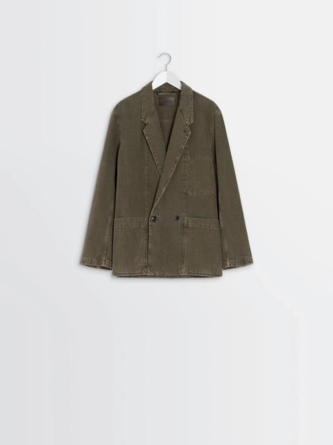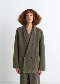 Inspired by Lemaire's taste for the link between comfort and elegance, this blazer is in keeping with the workwear spirit dear to the house. It is made from thick denim that has been garment-dyed to give it a snowy patina. DETAILS Workwear blazer in garment-dyed denim with a snow wash Oversized cut Tailored collar with buttonhole and under-button collar Long sleeves Crossover button closure Patch side pockets Inside patch pocket Interior Lemaire embossed leather label Made in Morocco Style : JA1062 LD1062 The model is 177 cm tall and is wearing a size 36 (S). FABRICS & CARE Main Material: 100% Cotton Jacron: 100% Cow Leather