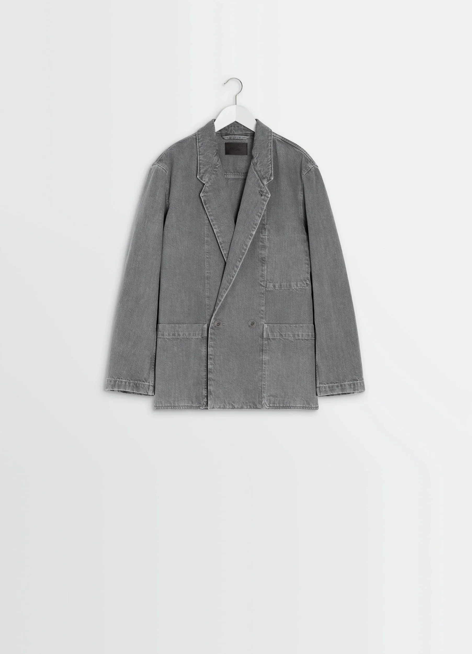 Inspired by Lemaire's taste for the link between comfort and elegance, this blazer is in keeping with the workwear spirit dear to the house. It is made from thick denim that has been garment-dyed to give it a snowy patina. DETAILS Workwear blazer in garment-dyed denim with a snow wash Oversized cut Tailored collar with buttonhole and under-button collar Long sleeves Crossover button closure Patch side pockets Inside patch pocket Interior Lemaire embossed leather label Made in Morocco Style : JA1062 LD1062 The model is 177 cm tall and is wearing a size 36 (S). FABRICS & CARE Main Material: 100% Cotton Jacron: 100% Cow Leather