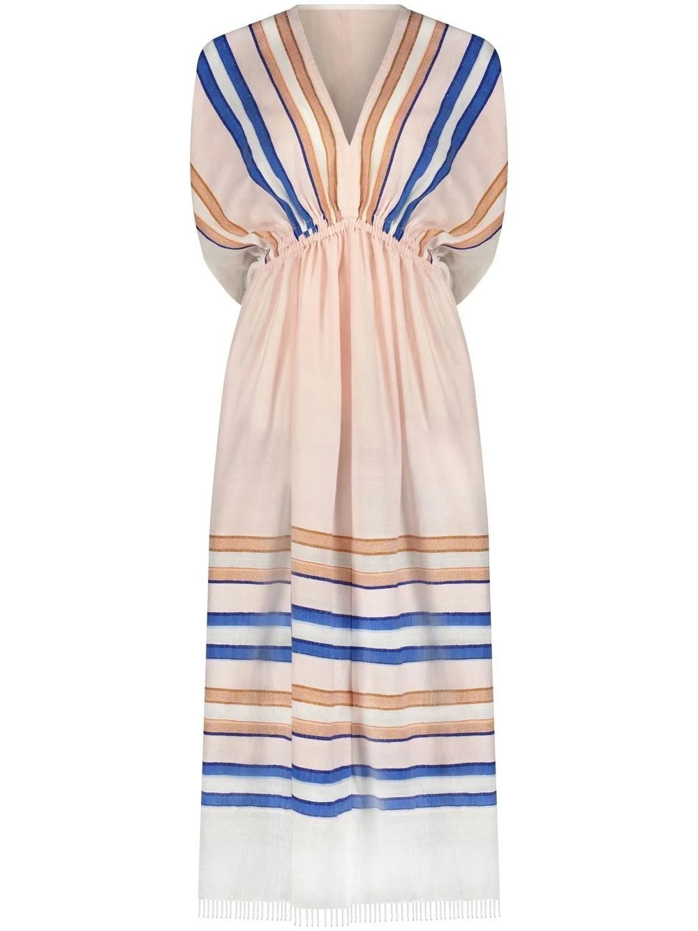 Eskedar stripe-print midi dress Highlights - White/multicolour - Cotton blend - Ombre effect - Stripe print - Fringed edge - Elasticated waistband - High-waisted - Dolman sleeves - Straight hem Imported Composition Cotton 95%, Acrylic 5% Washing instructions Hand Wash